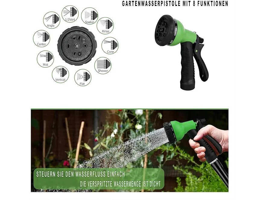 Ongeopend, Flexibele uit-rekbare tuinslang 15 m met spuitmond, groen, B0D4ZHGYPL