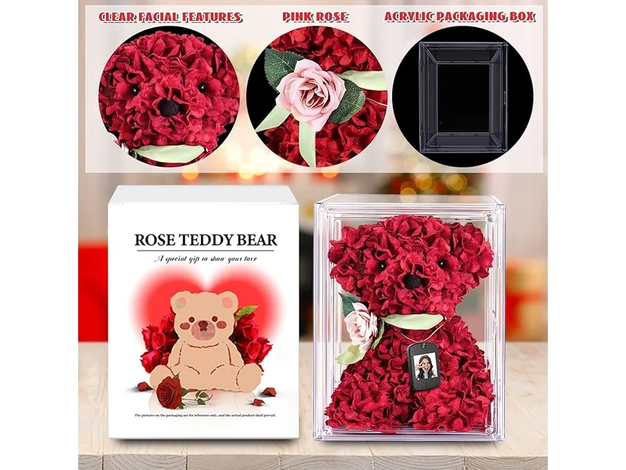 Ongeopend, Aloskart Bloemenbeer met halsketting, hanger, rozenbeer met Smart Ink Screen Photo Display en groeten (rood), incl acrylic doos, zijdestof 25cm hoog , B0D9Q1V8X1