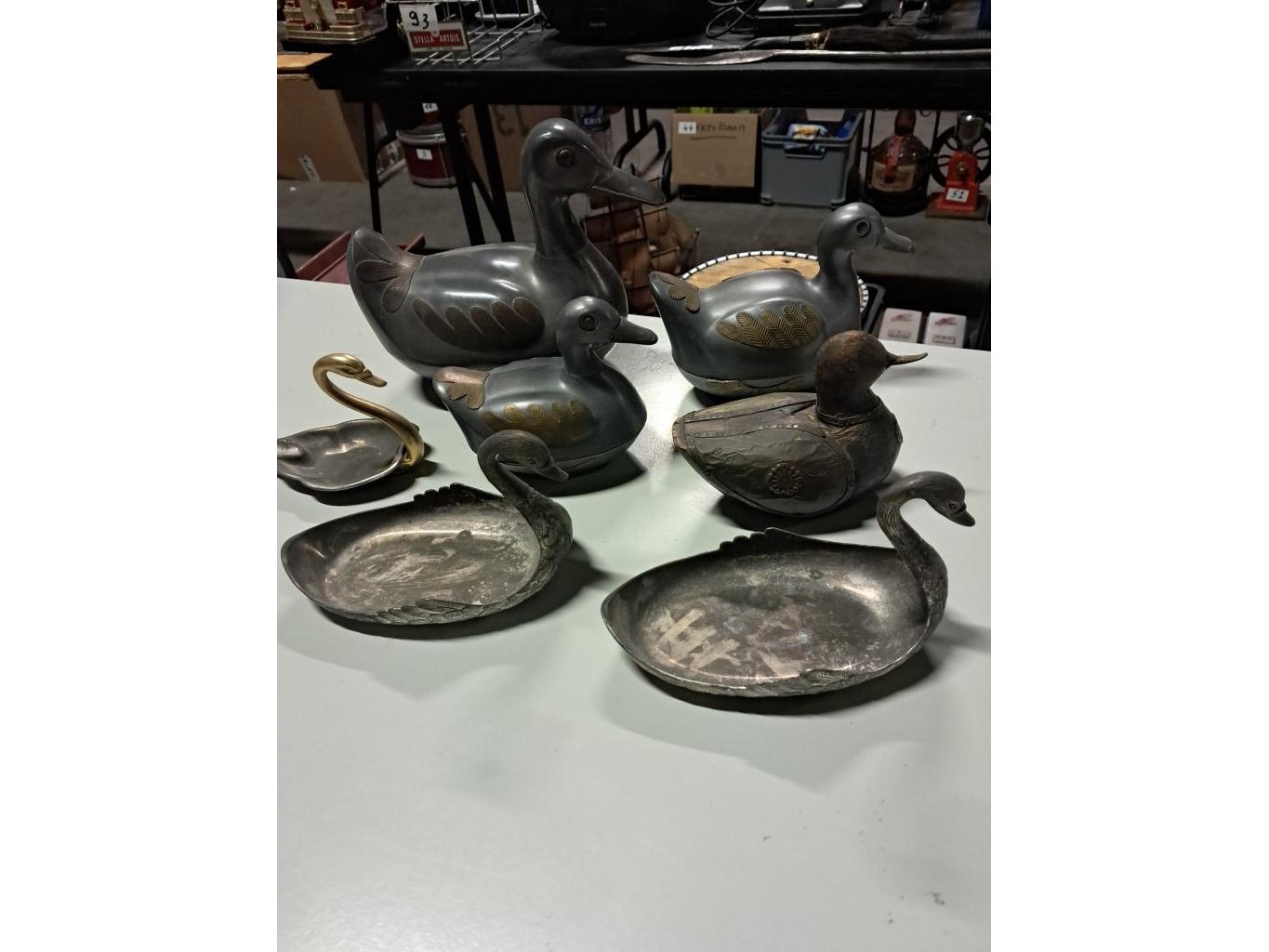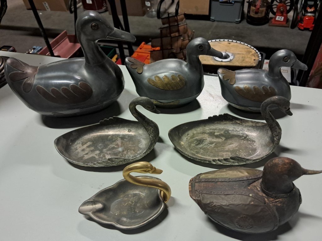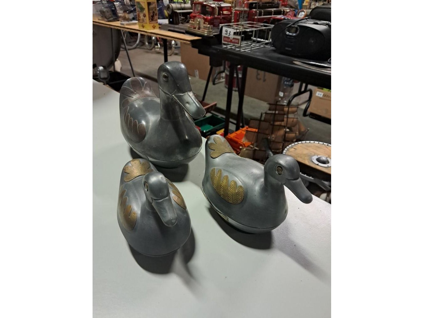 Drie tinnen eenden ,1 in hout en 3 in schaalvorm