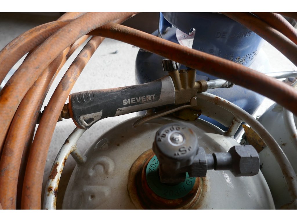 Gasbrander met slang<br /> *merk : SIEVERT<br /> 3 lege gasflessen