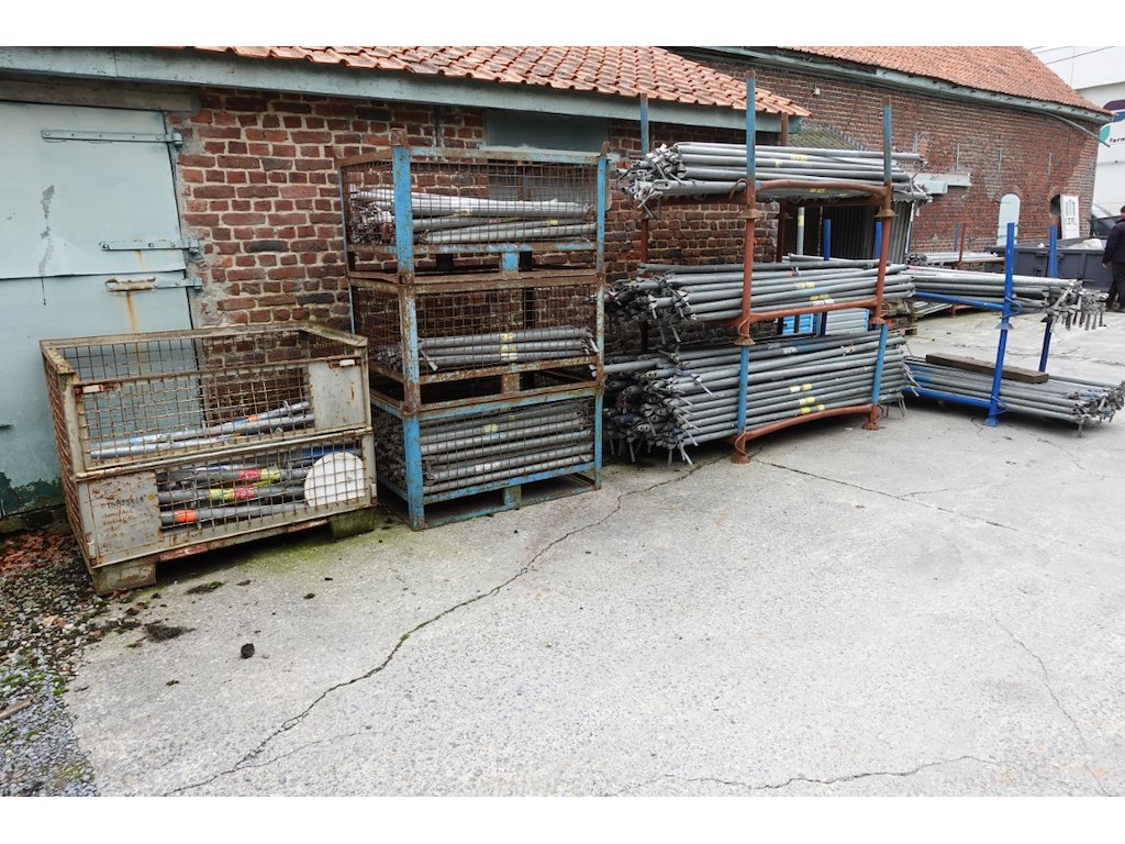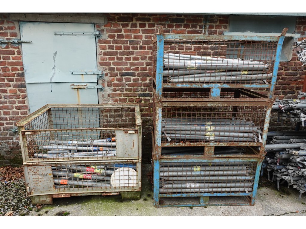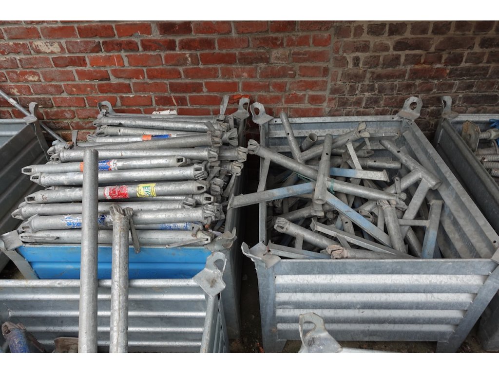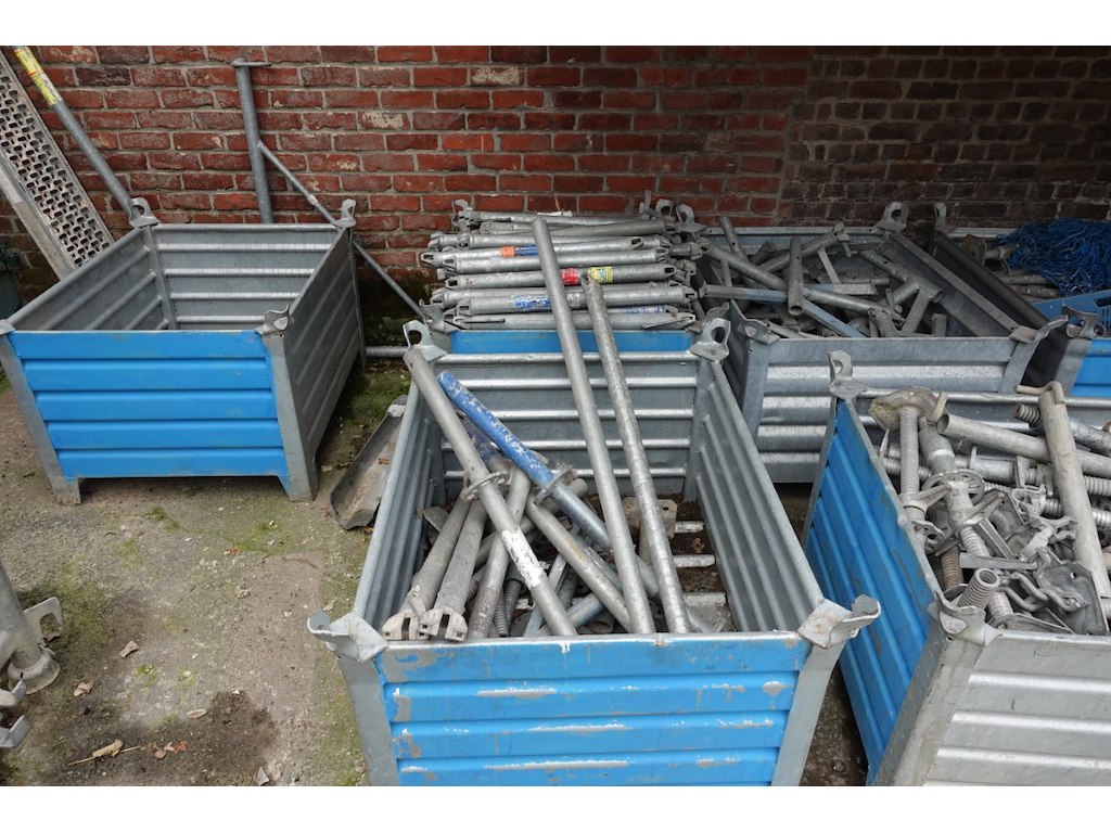 Bestaande uit 31 bakken/houders stellingonderdelen waaronder diagonalen, korte & lange verbindingsstukken, staanders, loopbruggen met en zonder trap, voeten,... <br /> locatie: buiten