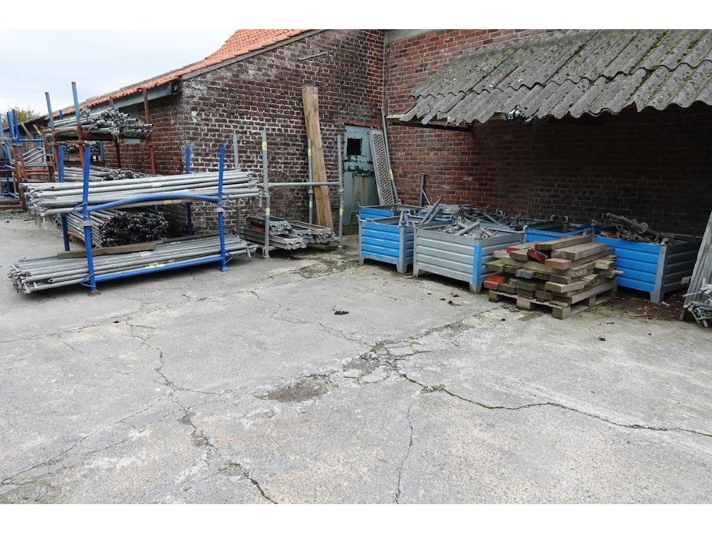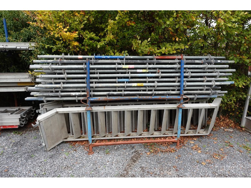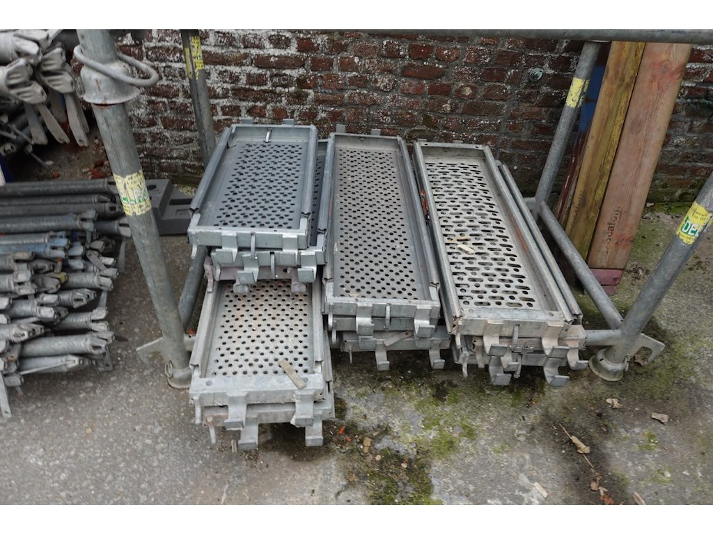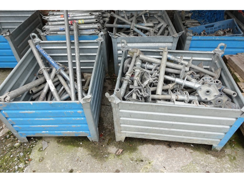 Bestaande uit 31 bakken/houders stellingonderdelen waaronder diagonalen, korte & lange verbindingsstukken, staanders, loopbruggen met en zonder trap, voeten,... <br /> locatie: buiten