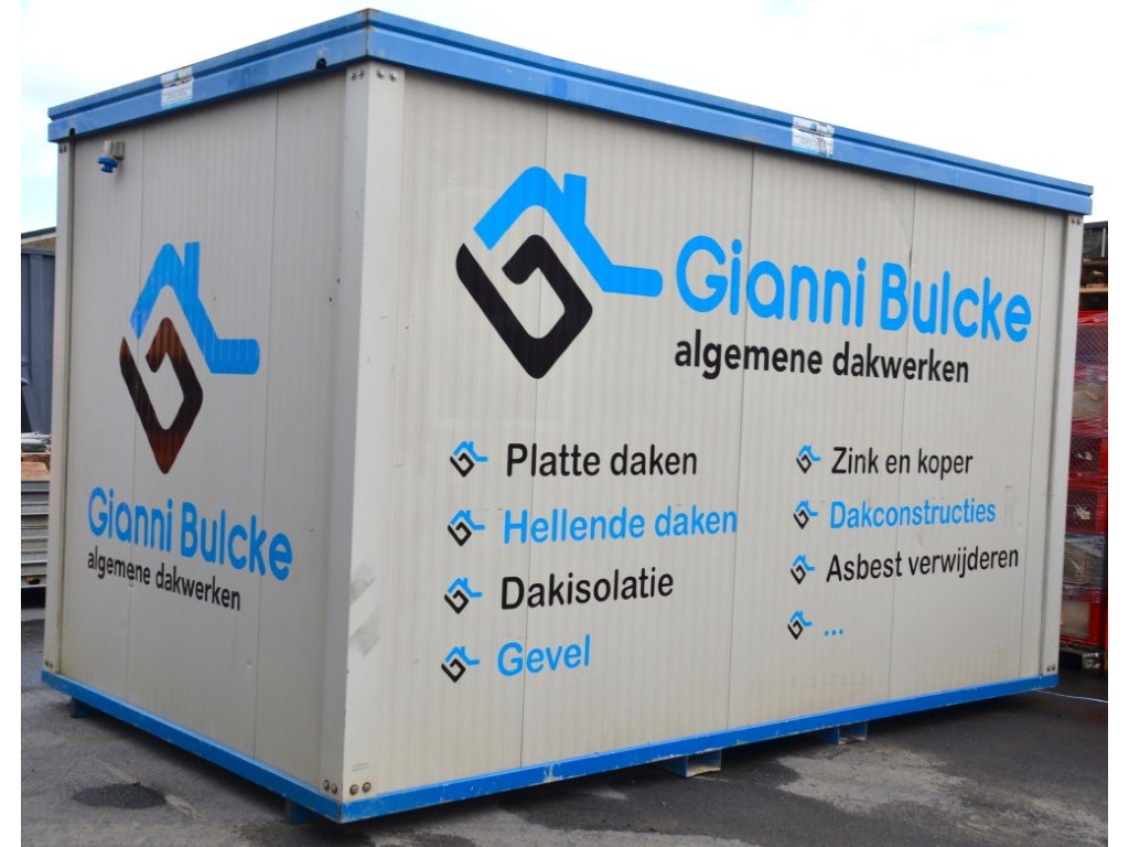 4000x2300x2400mm. Voorzien van schuifraam, deur en stopcontacten. Incl. tafel, stoelen, elektrisch vuurtje en enige zeilen en houten planken.