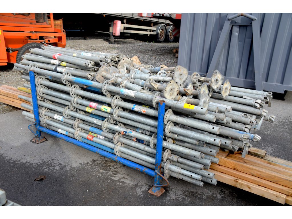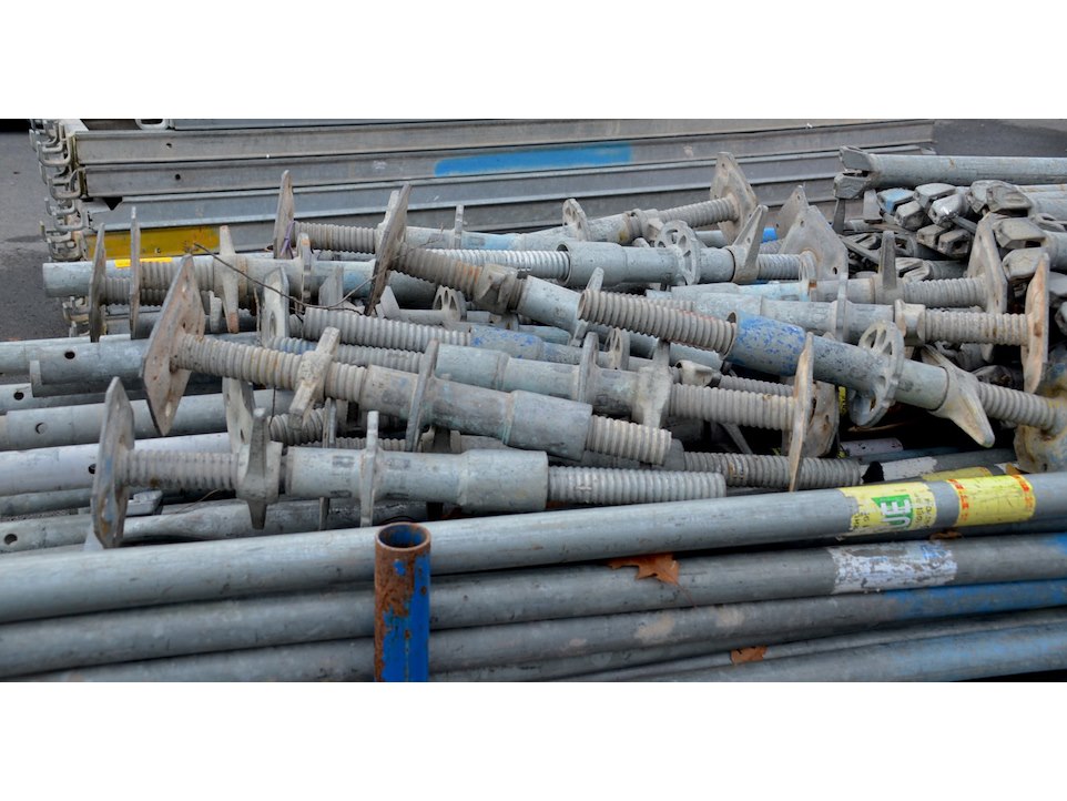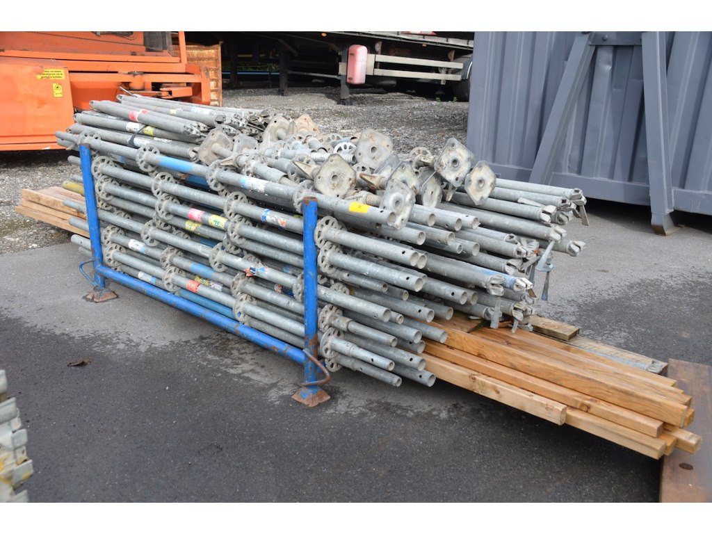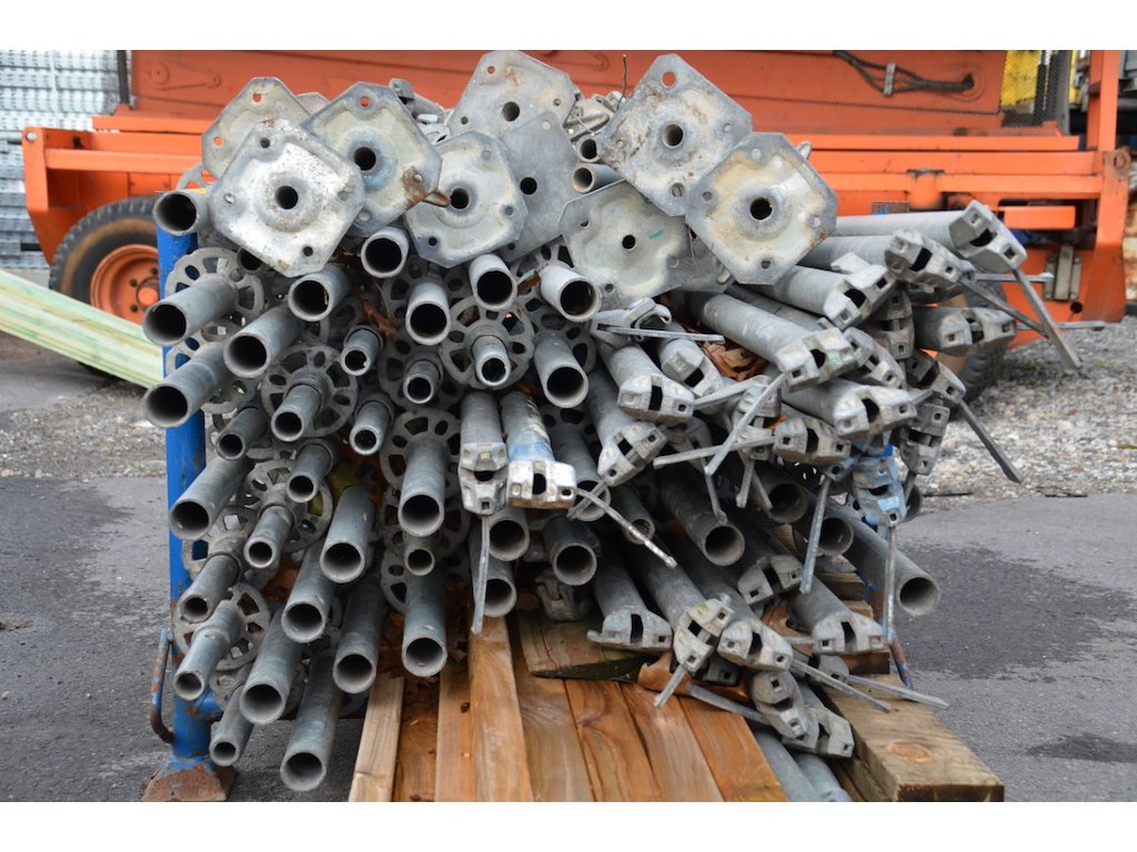 Plm. 30 staanders, 20 voetstukken, 30 tussenstukken 900mm, 30 buizen 2400mm. Partij houten latten.