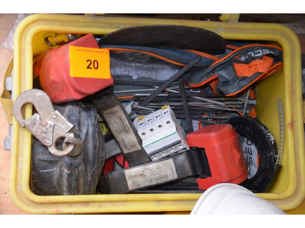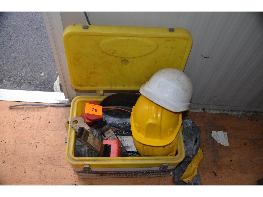 Diverse werkmateriaal en werfhelmen. Incl. 4 dakpannen.