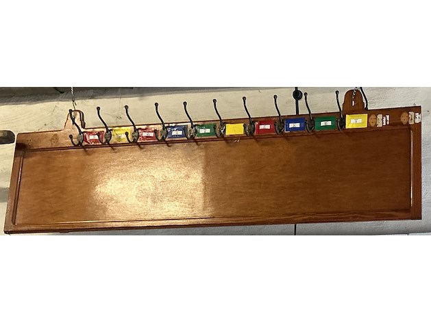 Grote houten schoolkapstok met 10 dubbele ijzeren haken