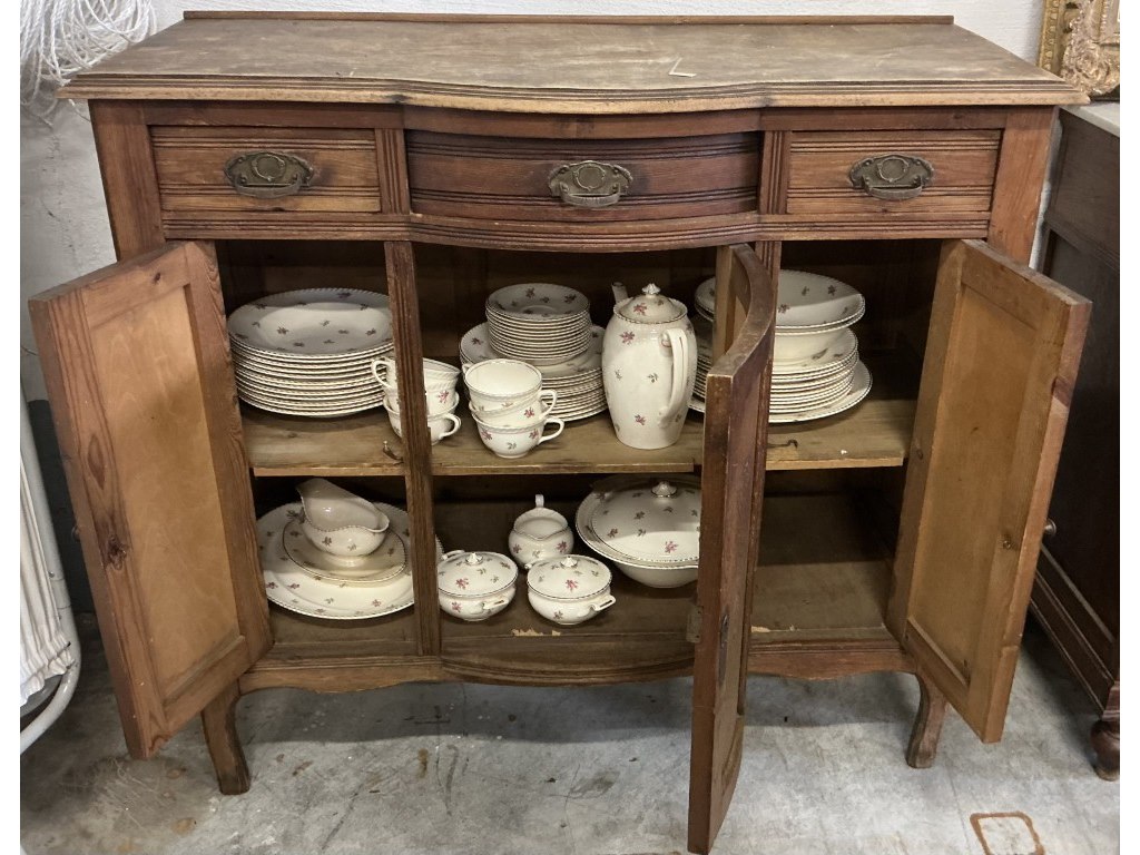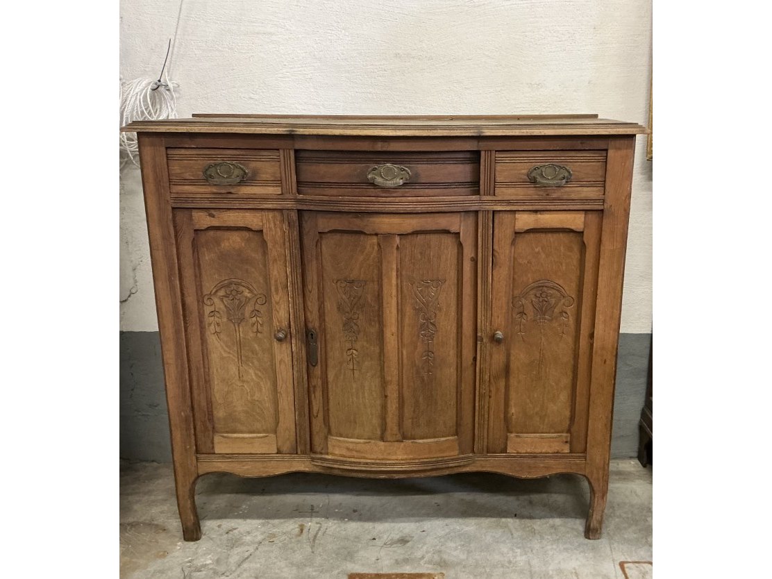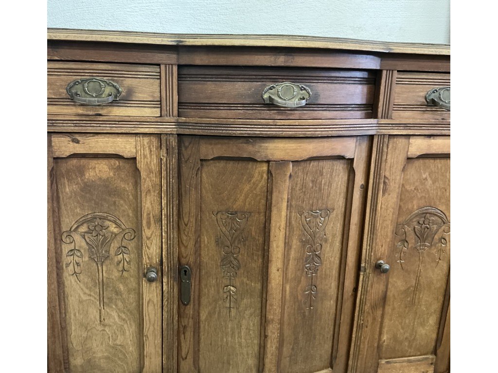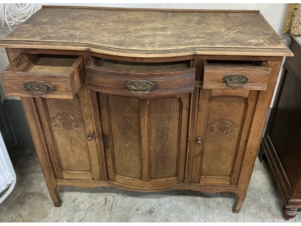Antiek bruin kastje met 3 schuiven, mooi gesculpteert