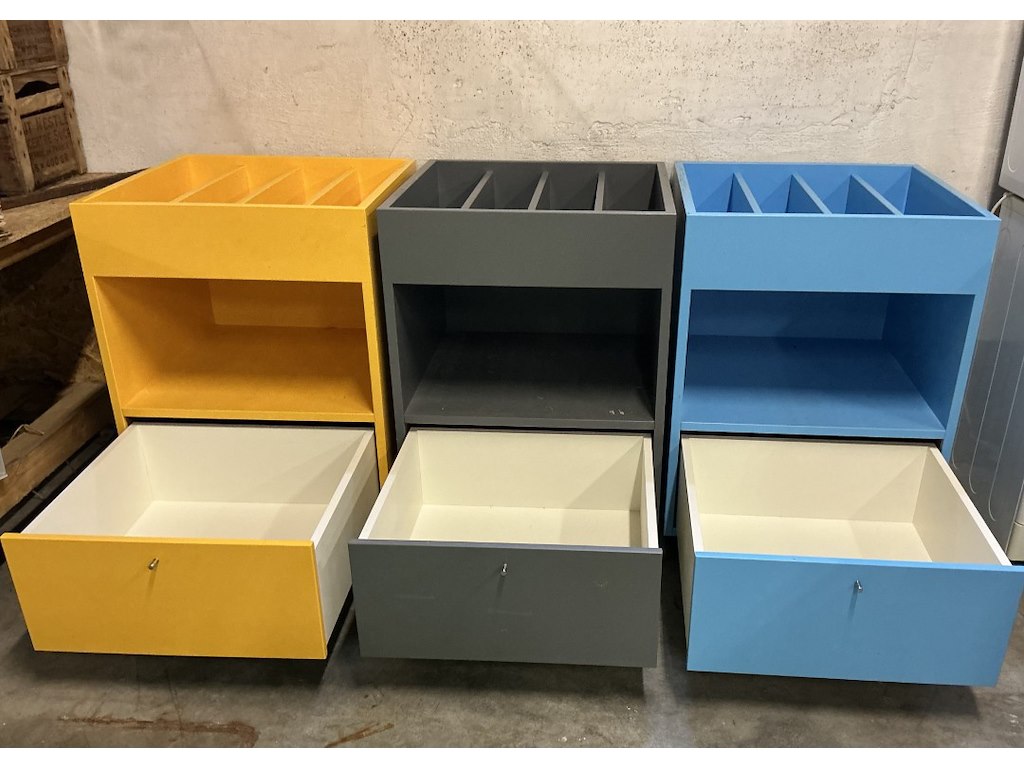 3 x gekleurde kastjes op wielen, presentatie, grote schuif onderaan