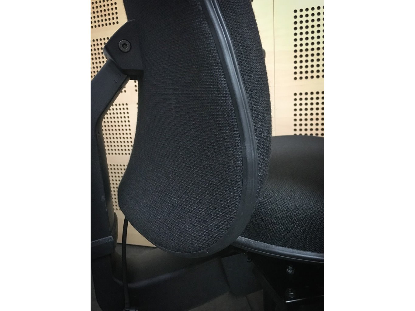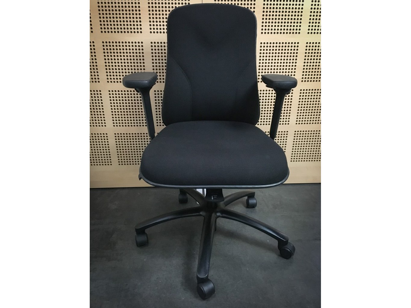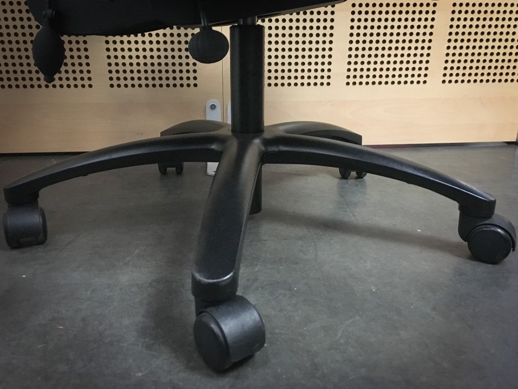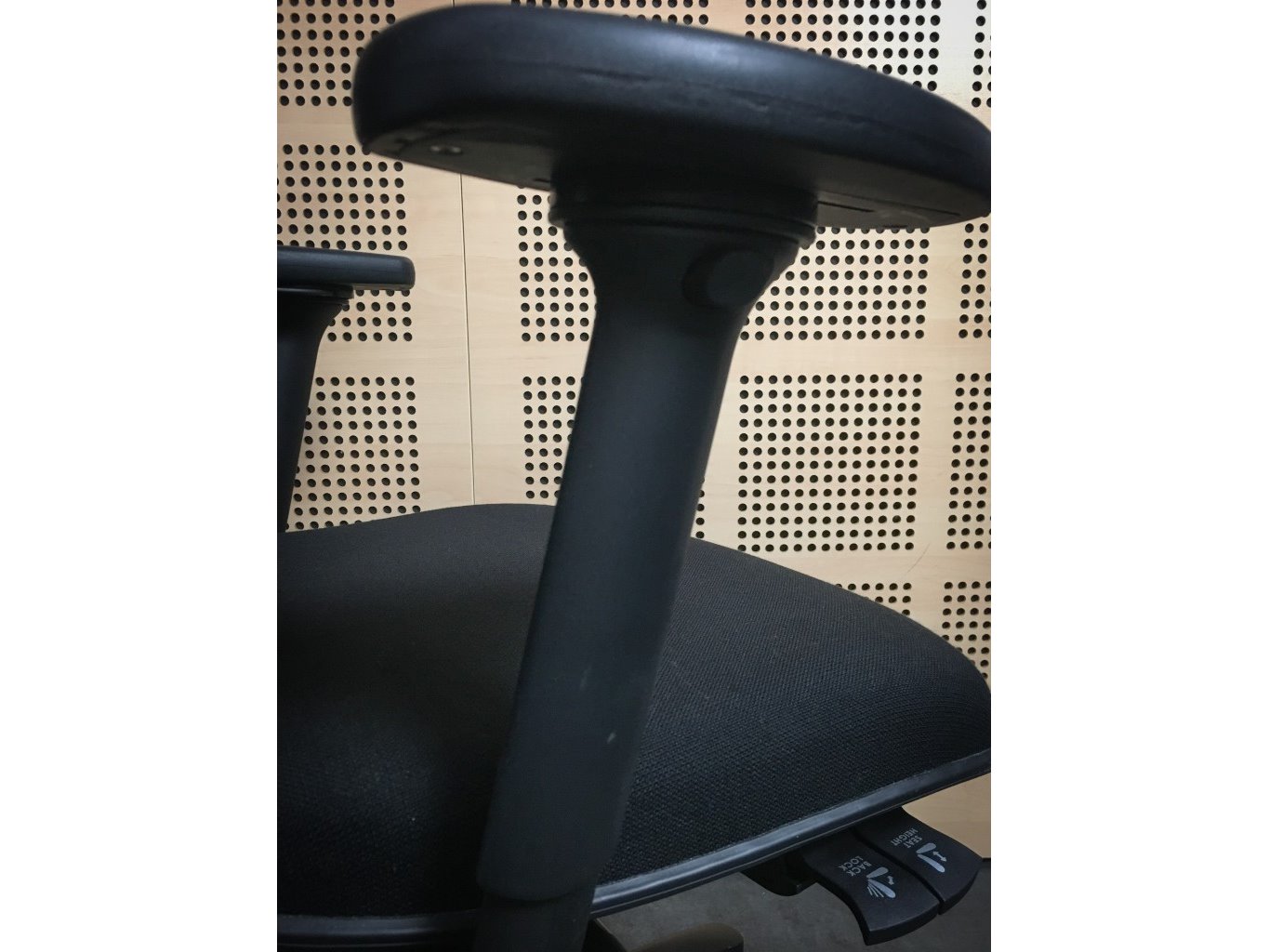 1x HÖGANÄS +561 Bureaustoel - Zwart Stof, zwart metalen voetkruis met wielen, lichte gebruikssporen op armleuningpads en onderstel, niet gereinigd