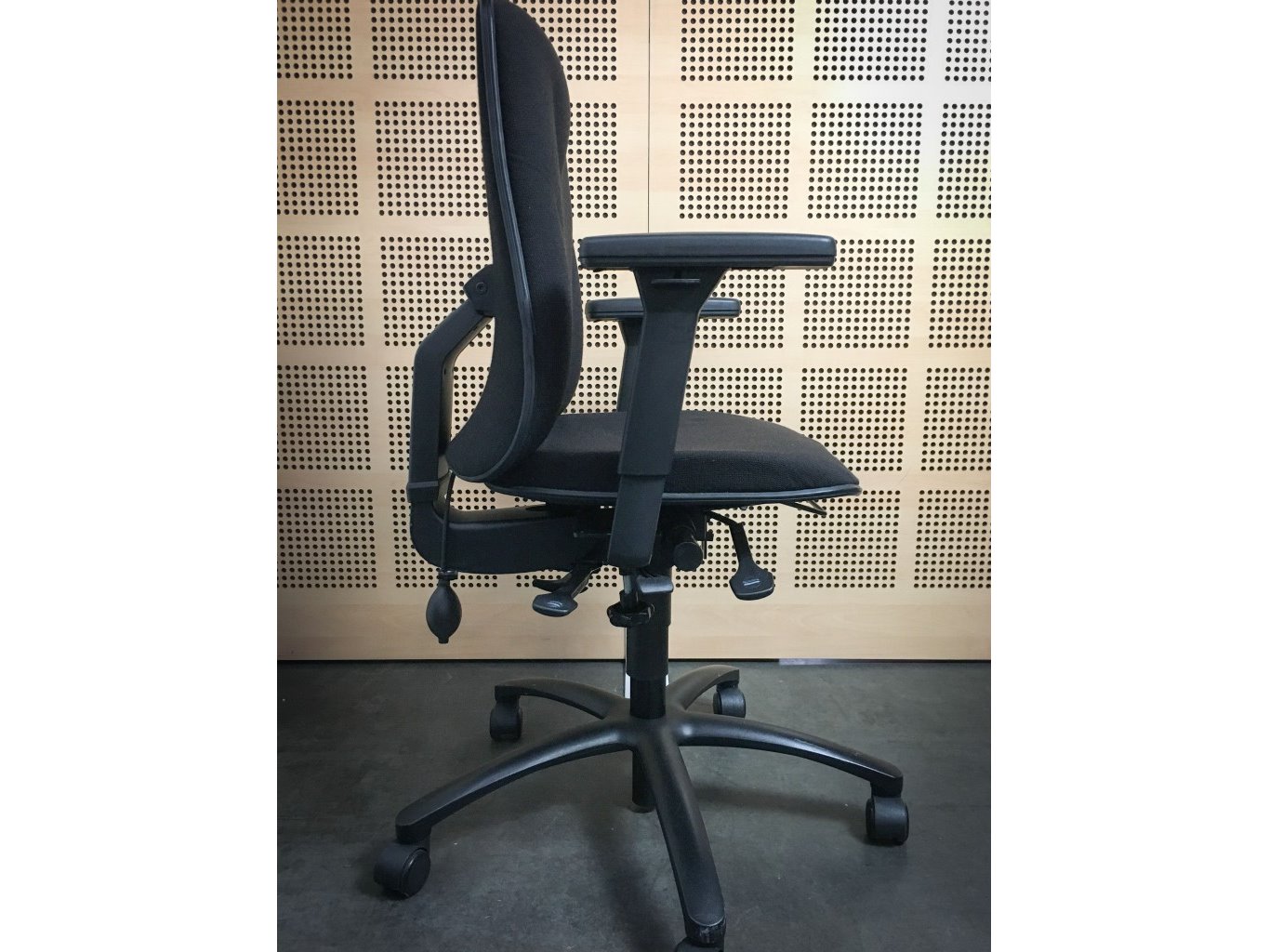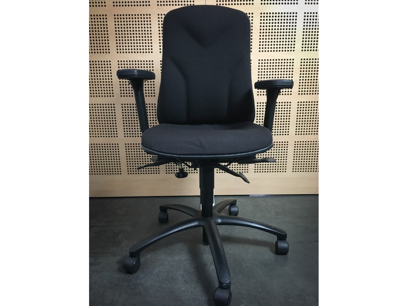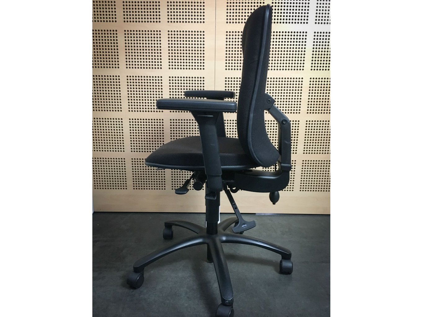 1x HÖGANÄS +561 Bureaustoel - Zwart Stof, zwart metalen voetkruis met wielen, enkele gebruikssporen op onderstel en achterzijde, niet gereinigd