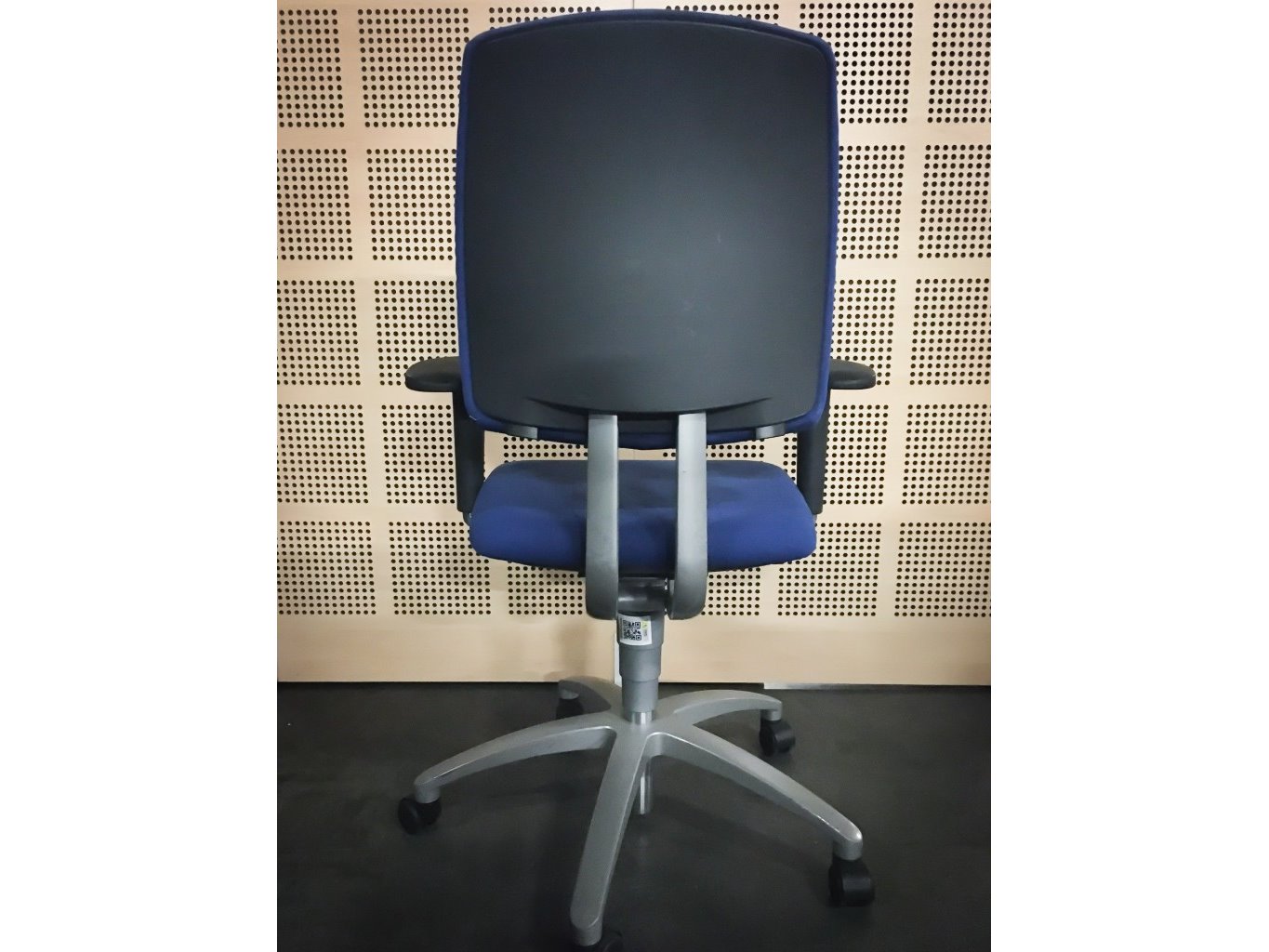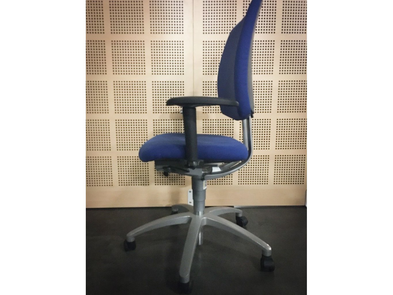 1x DRABERT Entrada Bureaustoel - Blauw Stof, grijs metalen voetkruis met wielen, gebruikssporen op armleuningen en voet, niet gereinigd