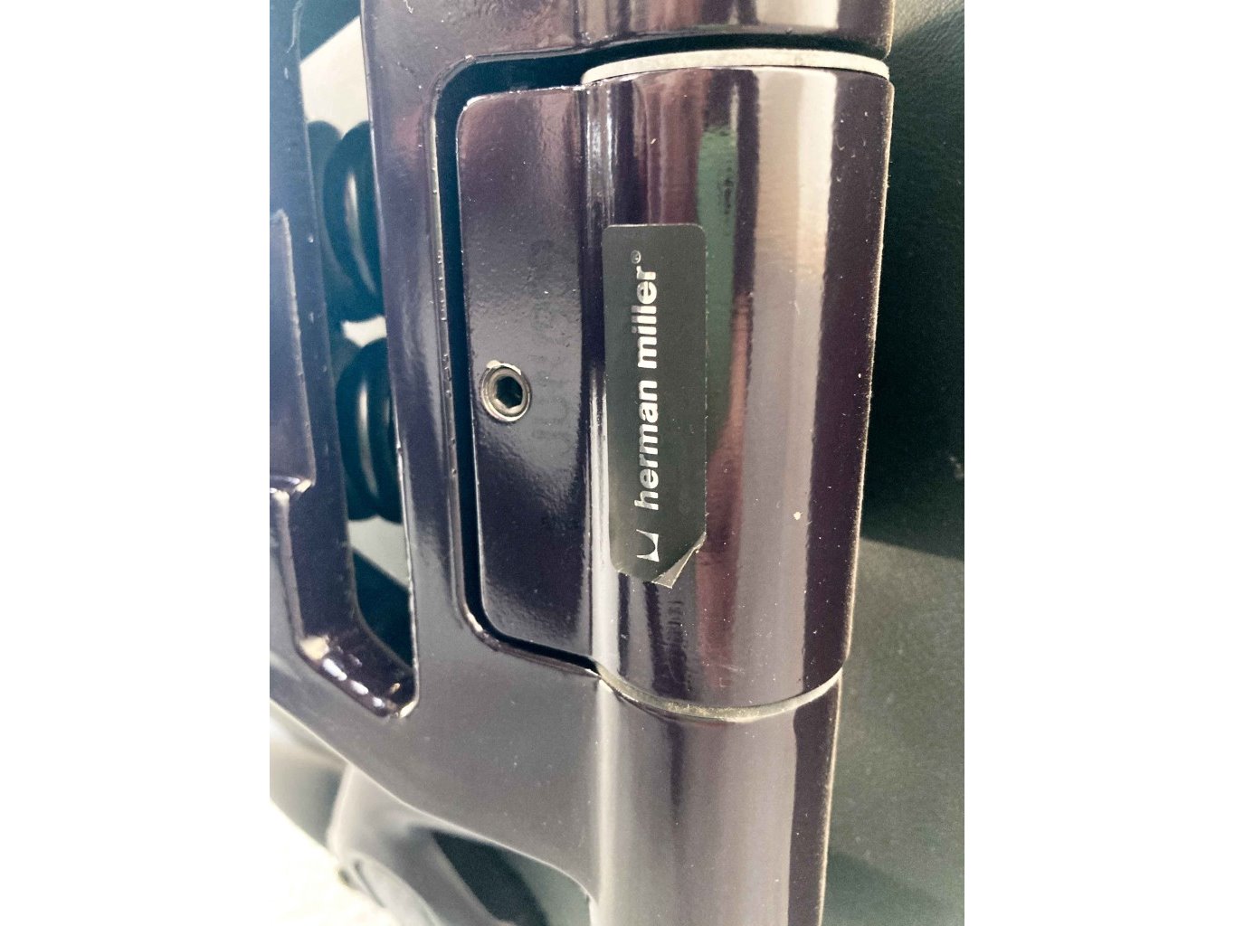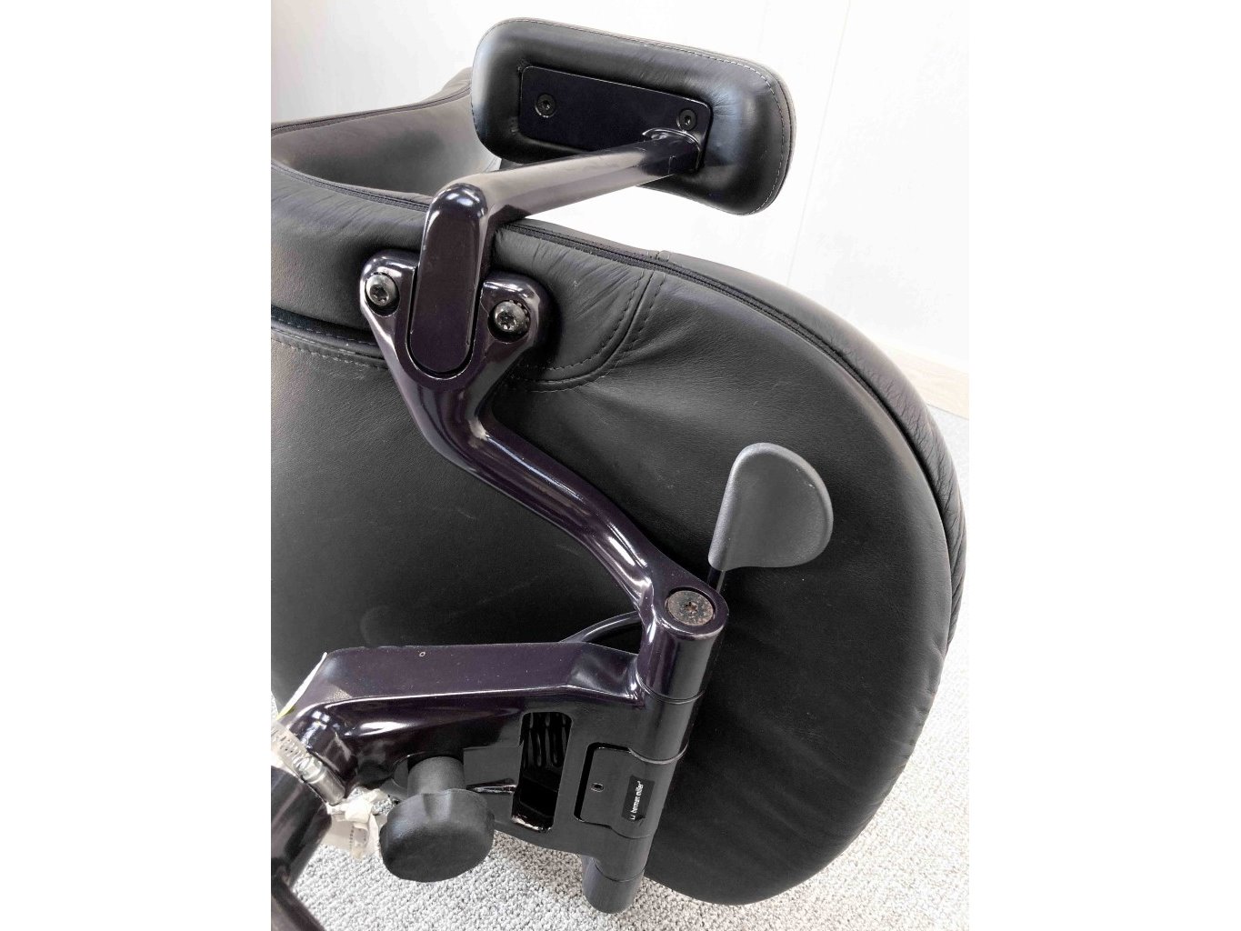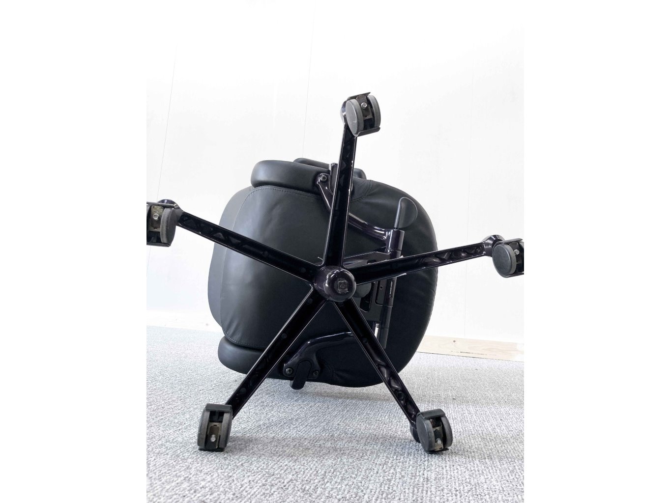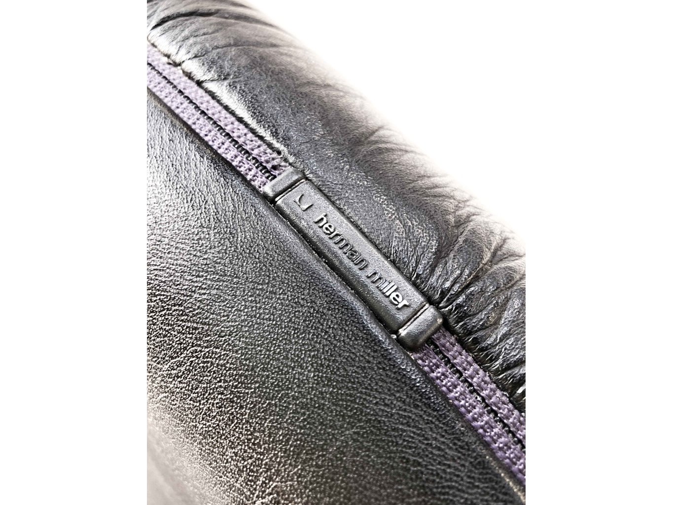 1x HERMAN MILLER Equa Executive Directiestoel – Zwart leer, donkerpaars metalen voetkruis met wielen, zichtbare gebruikssporen op leer, zitvlak 45 cm niet verstelbaar.