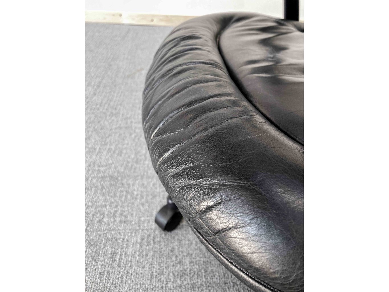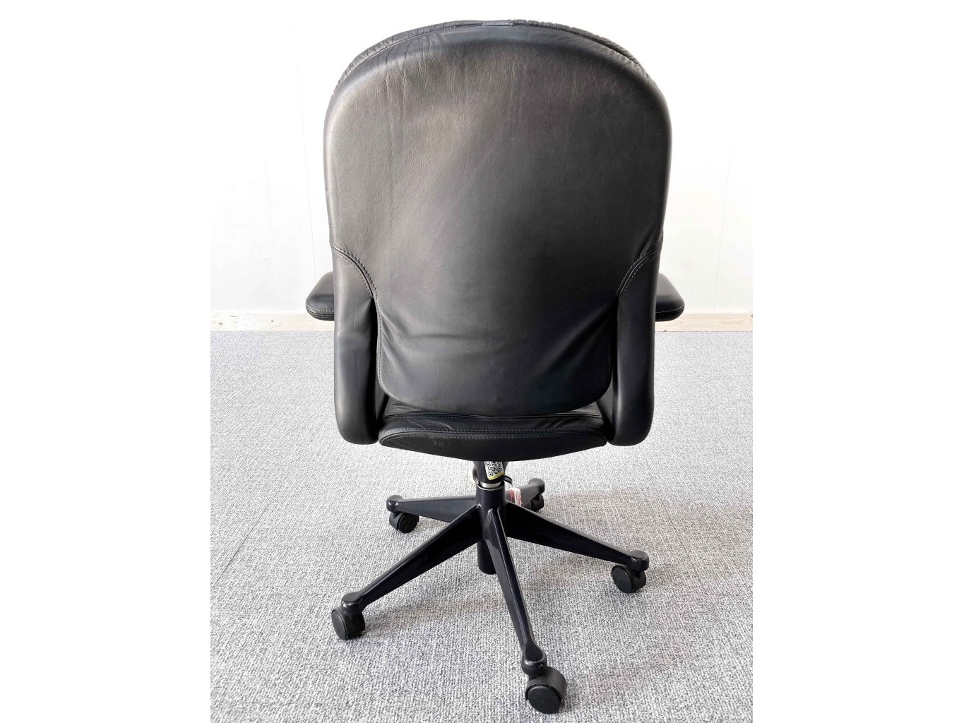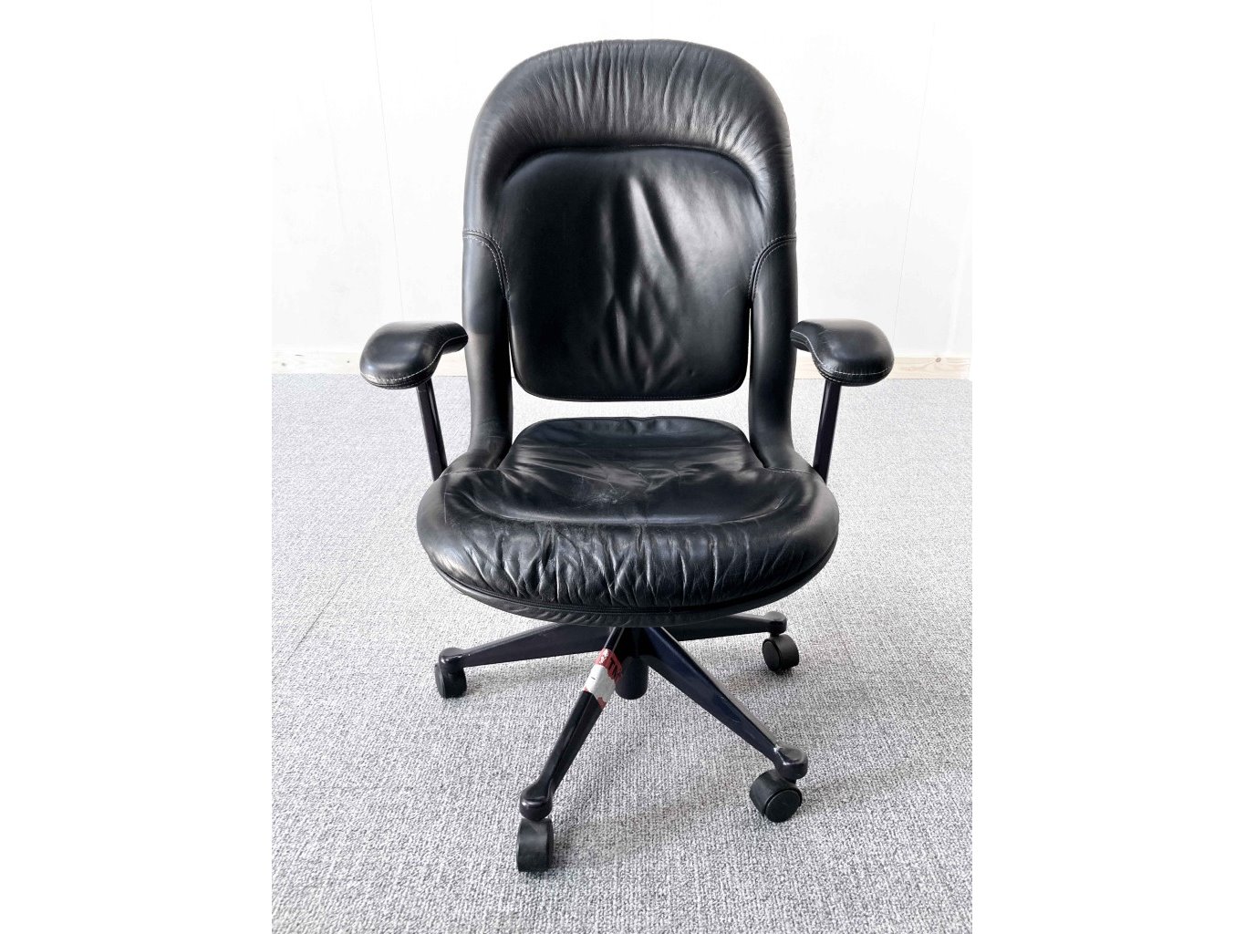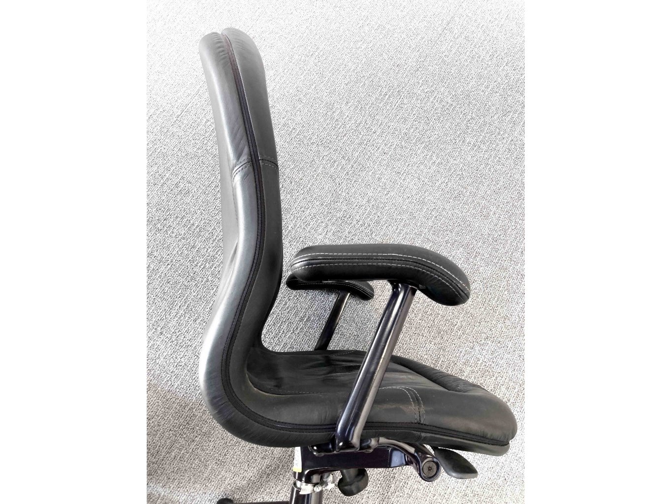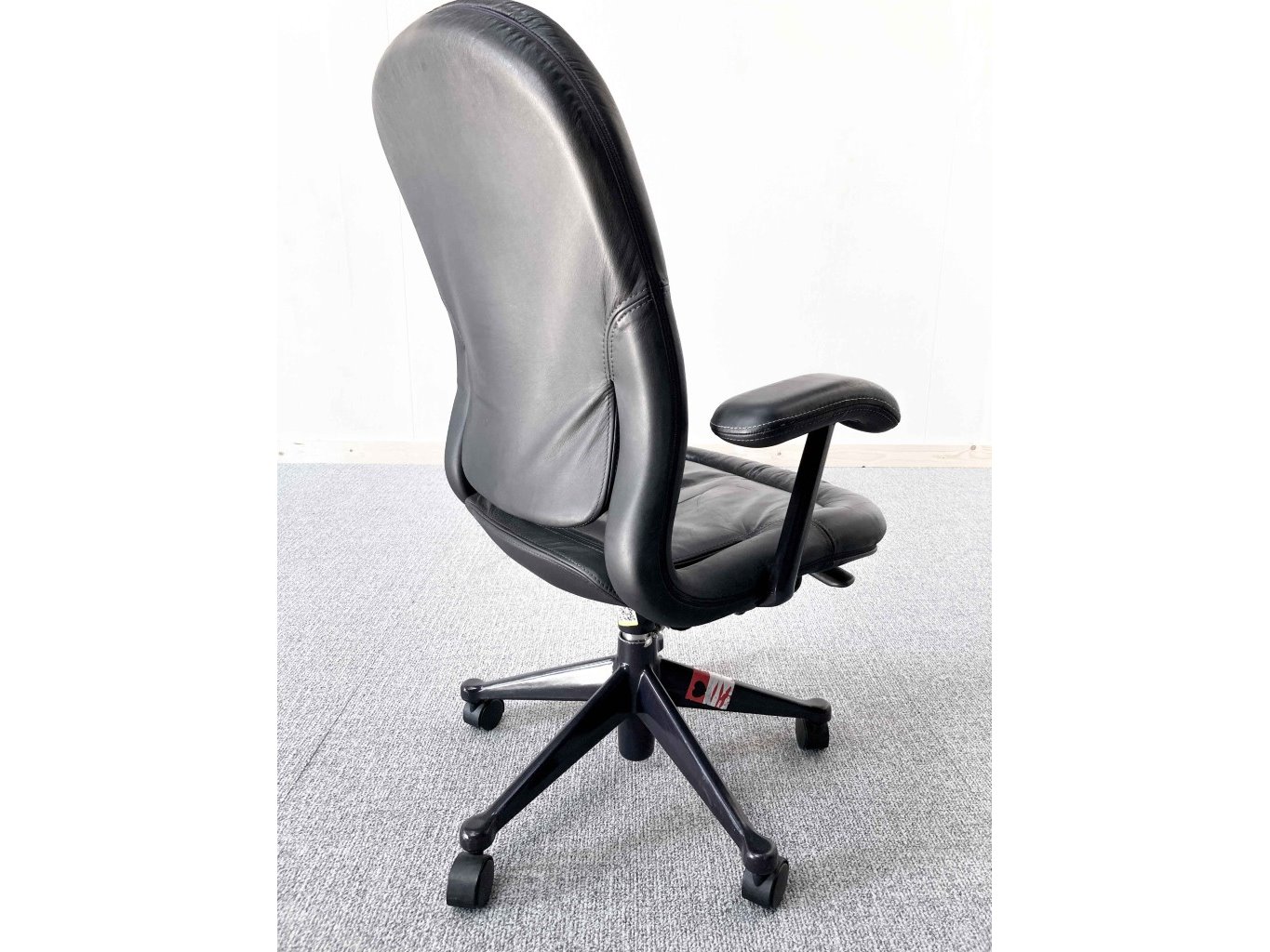 1x HERMAN MILLER Equa Executive Directiestoel – Zwart leer, donkerpaars metalen voetkruis met wielen, zichtbare gebruikssporen op leer, zitvlak 45 cm niet verstelbaar.
