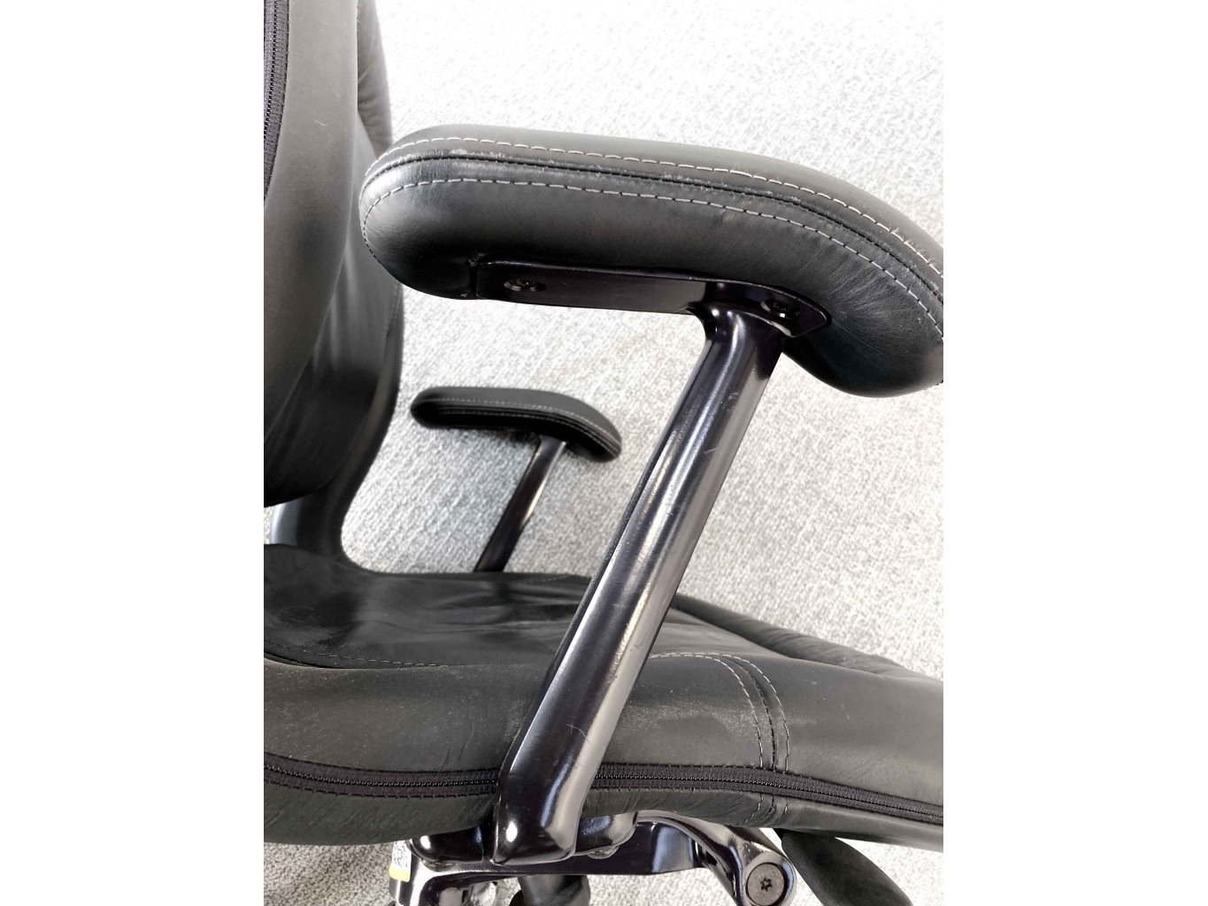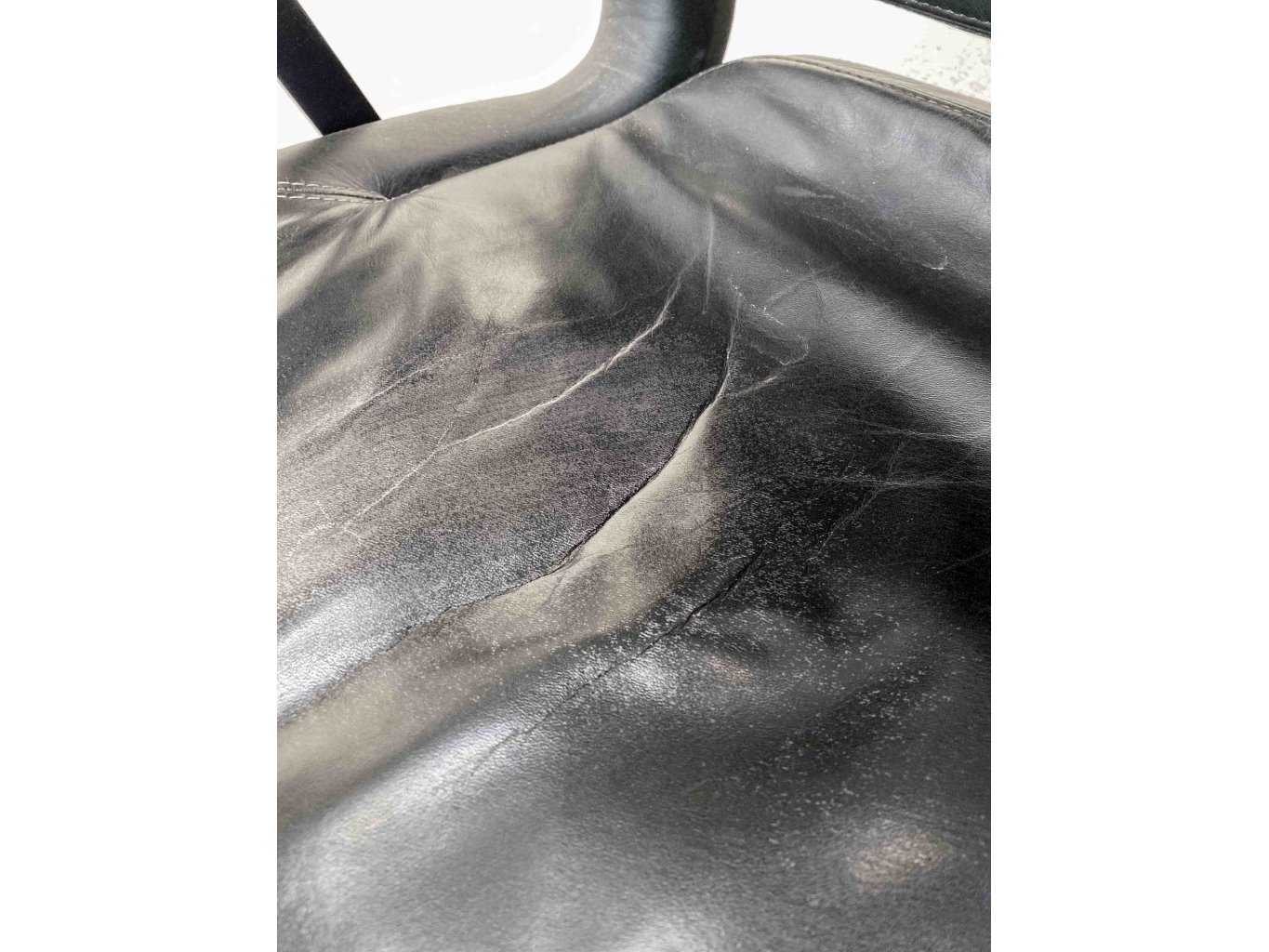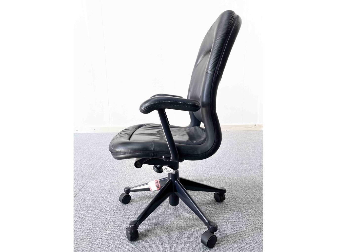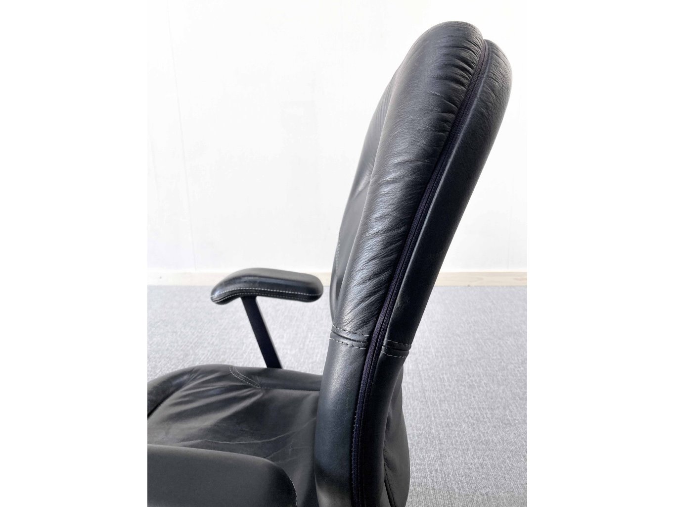 1x HERMAN MILLER Equa Executive Directiestoel – Zwart leer, donkerpaars metalen voetkruis met wielen, zichtbare gebruikssporen op leer, zitvlak 45 cm niet verstelbaar.