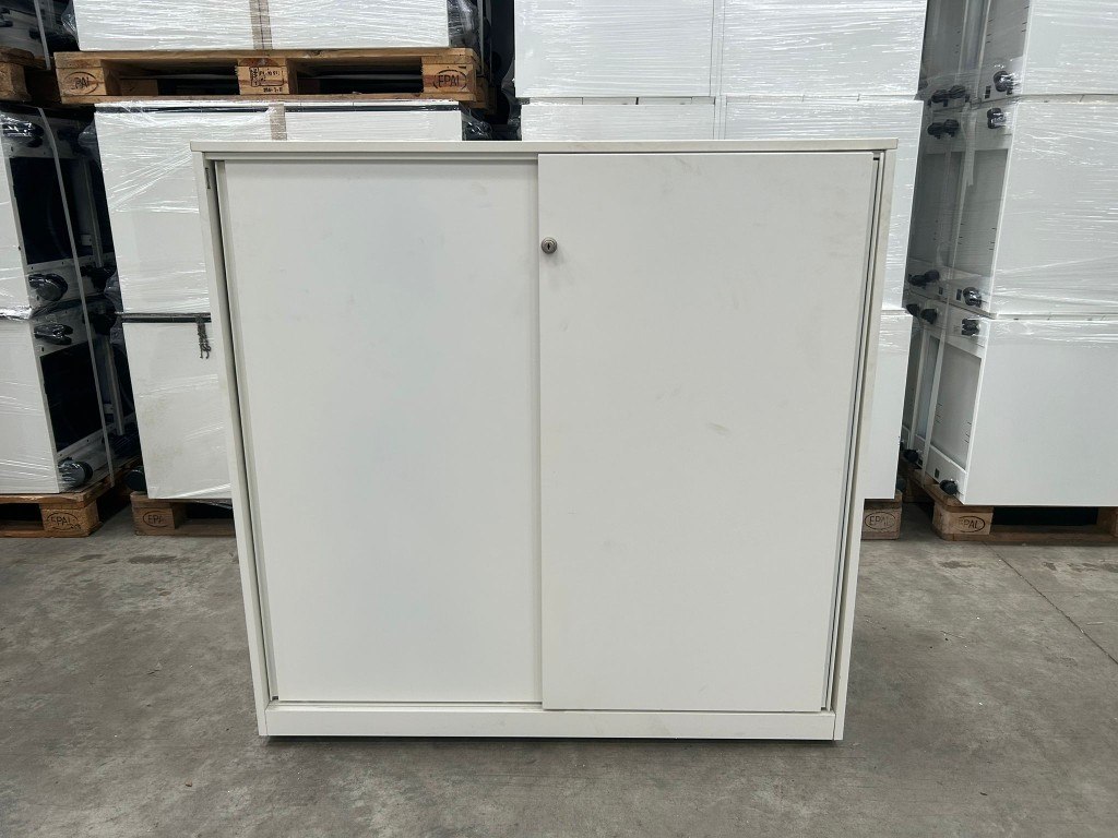 1x AHREND Halfh Schuifdeurkast H120xB120xD45 - Wit/Metaal, Geen sleutel , met enkele gebruikssporen