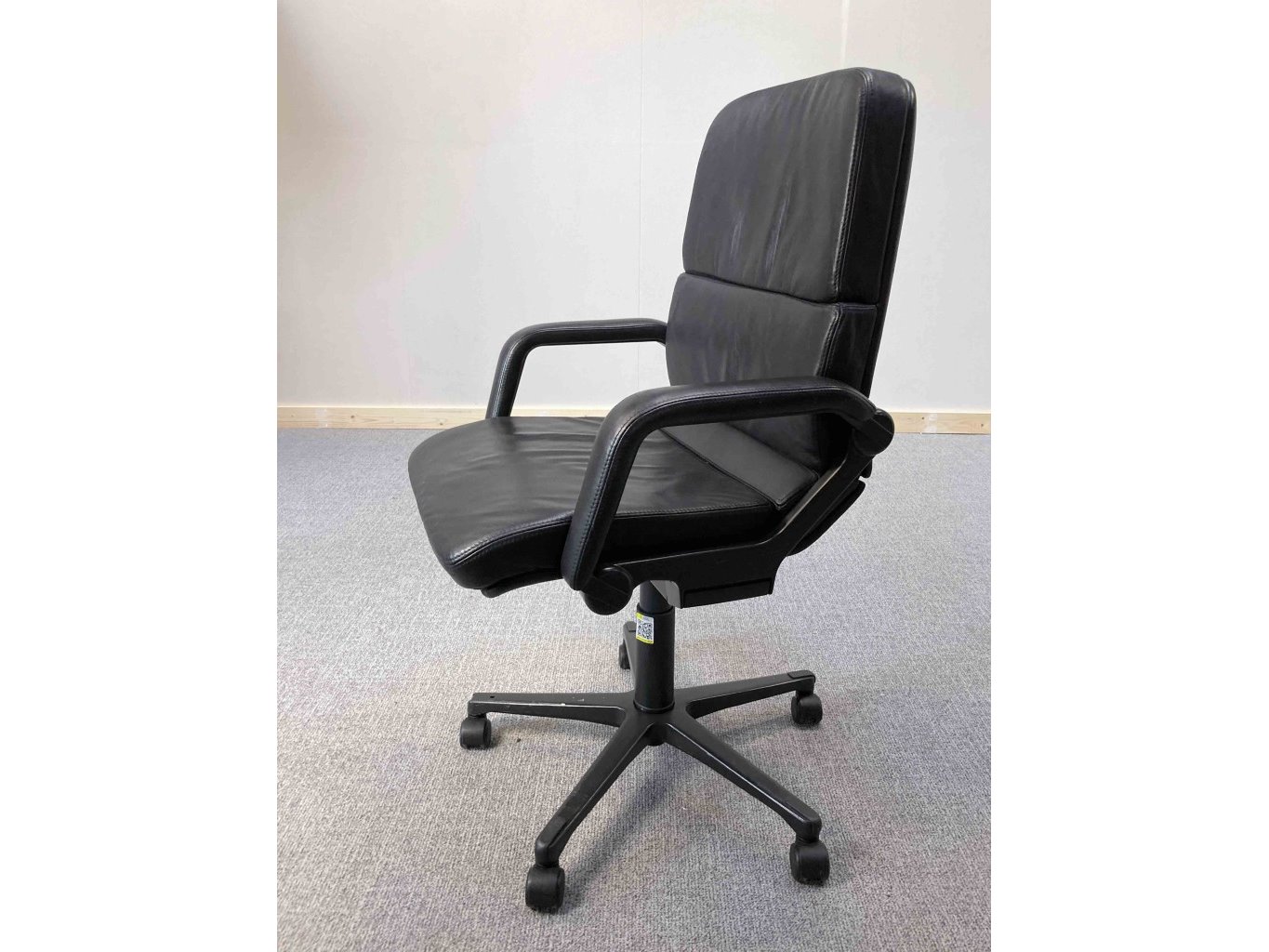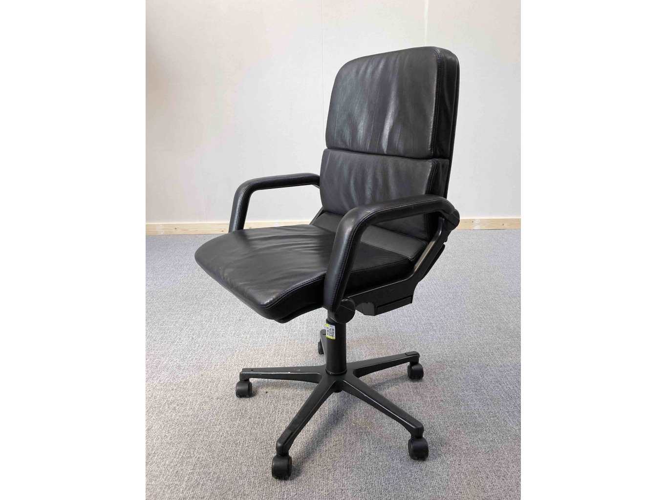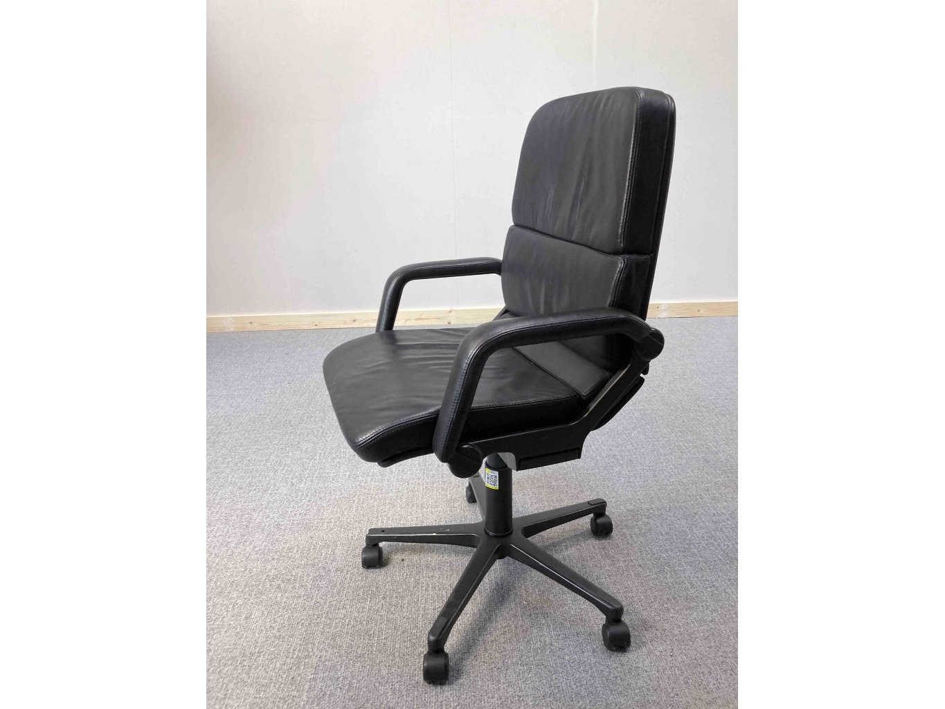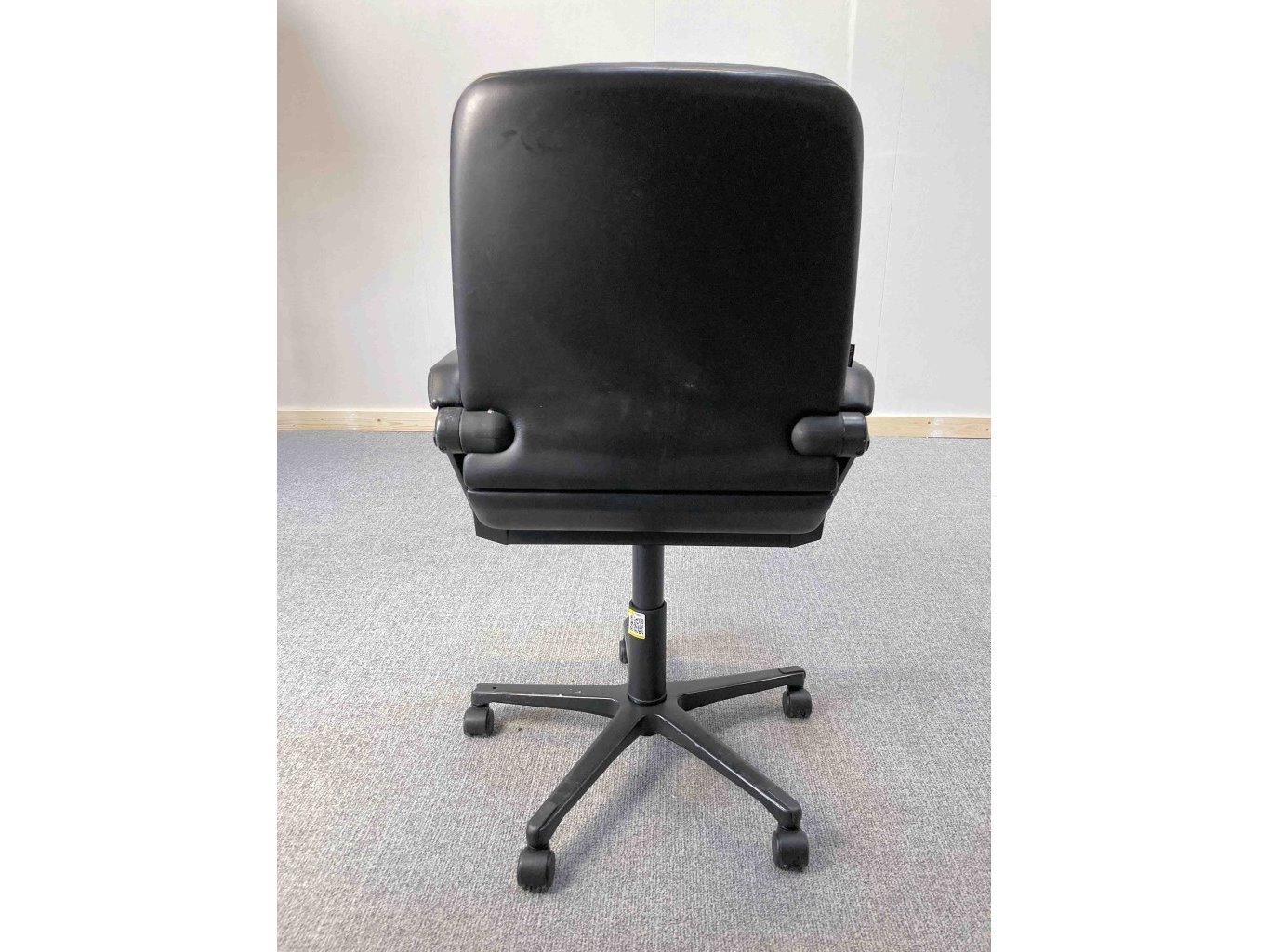 1x AHREND Cirkel Bureaustoel – Zwart, Leer, Zwart Metaal, Voetkr mt wielen, kleine gebruiksporen voetkruis, klein stuk voetkruis ontbreekt, wasbare vlek op zitvlak.