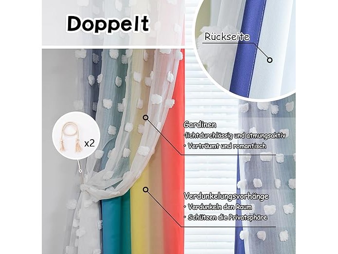 Ongeopend, ok, MYSKY HOME Kinderkamergordijnen met ringen, verduisteringsgordijn, ondoorzichtig, voile dubbellaags gordijn, gordijn met inslagringen, set van 2, H 213 x B 132 cm, regenboog, B0D8VYWGG9
