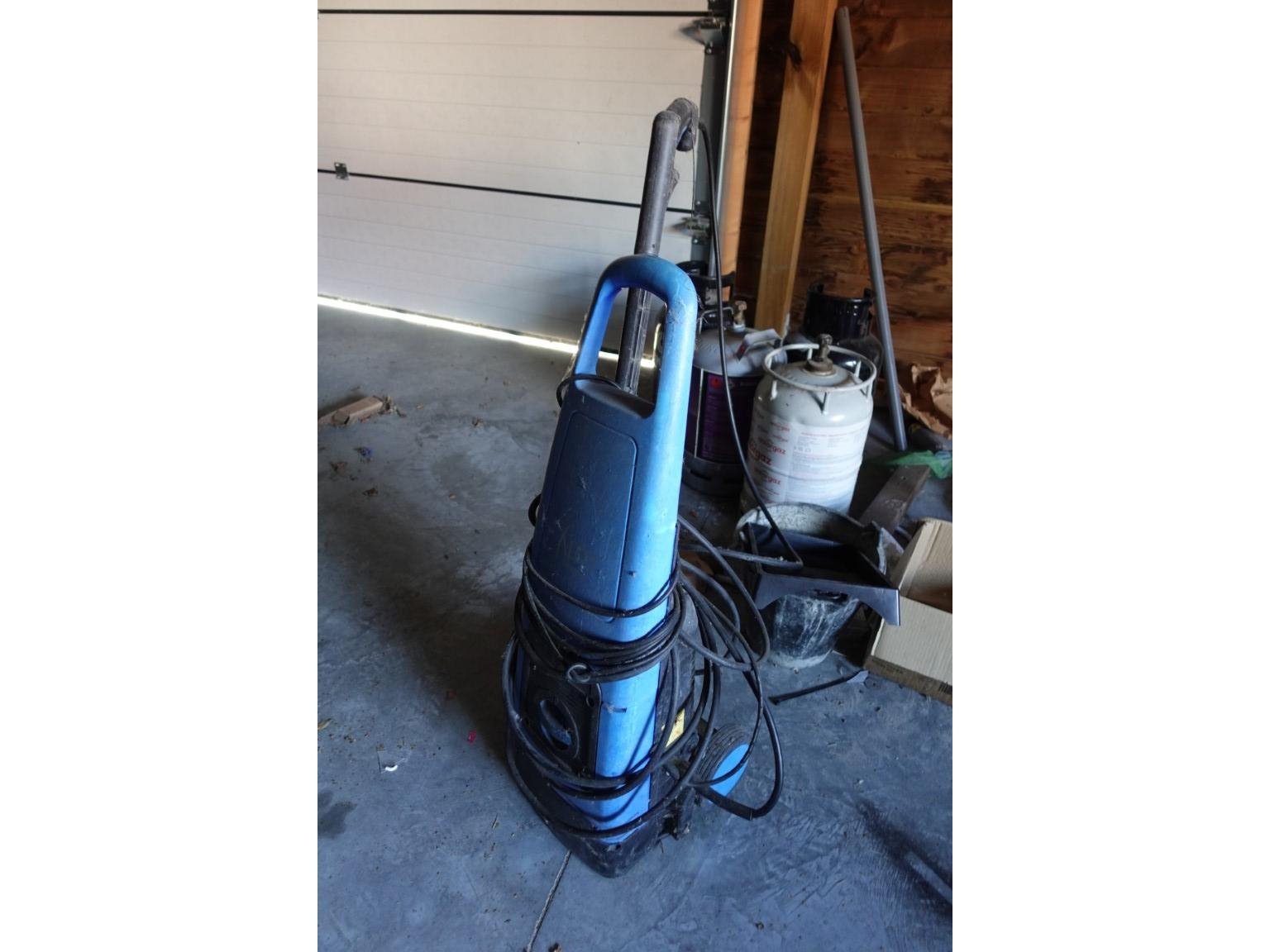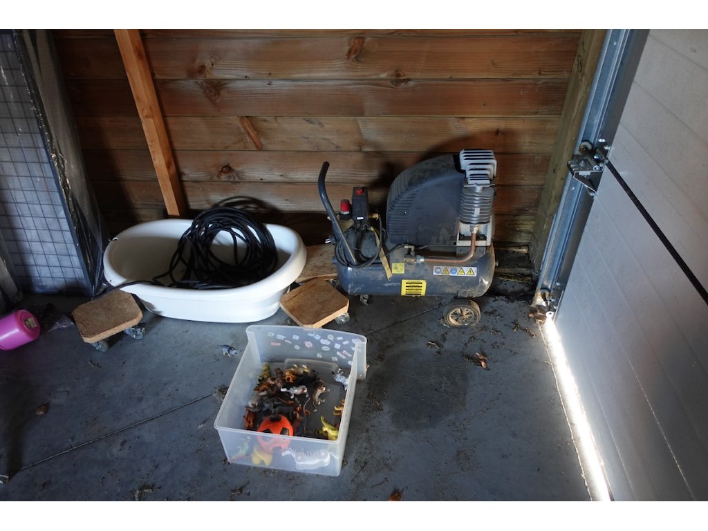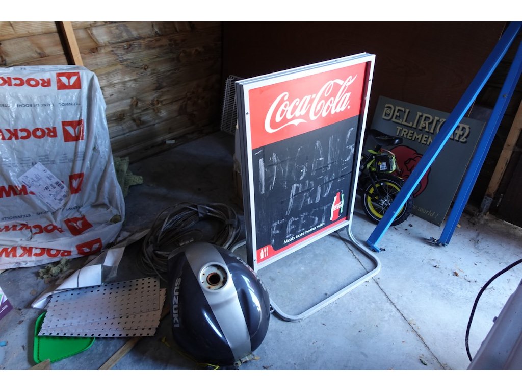 Oa: houten tafels, stoelen, fiets, reclameborden, hogedrukreiniger,...