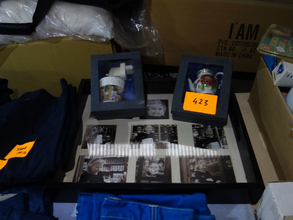 Dienblad met fotokaders en plig-in porseleinen potjes