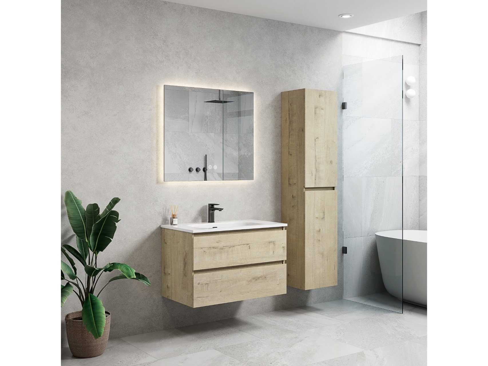 1 x 80cm Design badkamermeubelset Melamine ROMA 80-07 - Kleur: Licht Eik - Afm. B80xH50xD46CM - Mineraalmarmer wastafel - 2 Lades met softclose systeem - LED Spiegel 80x70cm (Verschillende kleurtemperaturen 3000K Warm-wit, 4000K Neutraal-wit, 6500K Koud-wit) + Anti Condens + Alle 3 de kleuren zijn dimbaar, zo kunt u het licht eenvoudig dimmen of feller maken tot het gewenste effect - kraan, krepin sifon en kolomkast niet inbegrepen -