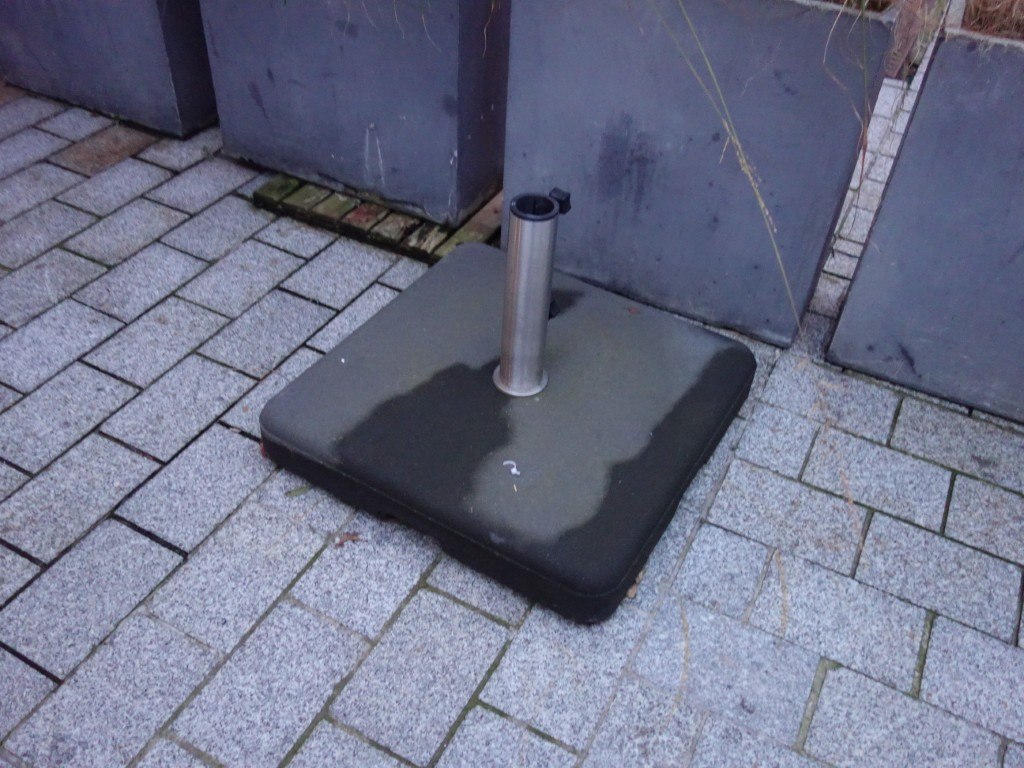 Vv : 2x parasol , 7 tafels , 7 stoelen , 4x plooistoel , 2x parasolvoet <br /> locatie: werkruimte