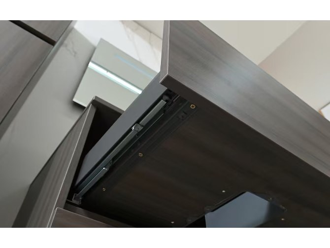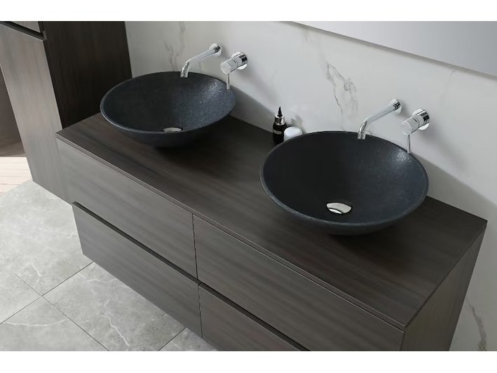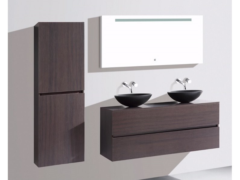 Aantal:1 <br /> Merk:Vonato <br /> Productnaam:Badkamermeubel 2 persoons <br /> Type:9010 <br /> Model:3-delig met waskommen <br /> Kleur:Donker hout decor, zwarte kommen <br /> Materiaal:Melamine, stenen waskommen <br /> Afmeting:3-delige set: <br /> 1 * Wastafelmeubel - 1300x470x550mm <br /> 1 * Zijkast - 1500x350x350mm <br /> 1 * Spiegel - 1300x600mm <br /> <br /> Voorzien van:Muurkranen inclusief pop-up afvoer – 4 stevige metalen lades - Softclose lade systeem – Stenen waskommen - LED spiegel - Voorgemonteerde zijkast en wastafelmeubel <br /> Conditie:Nieuw