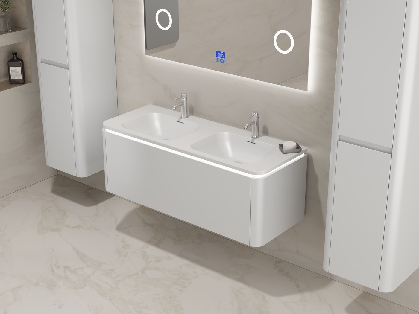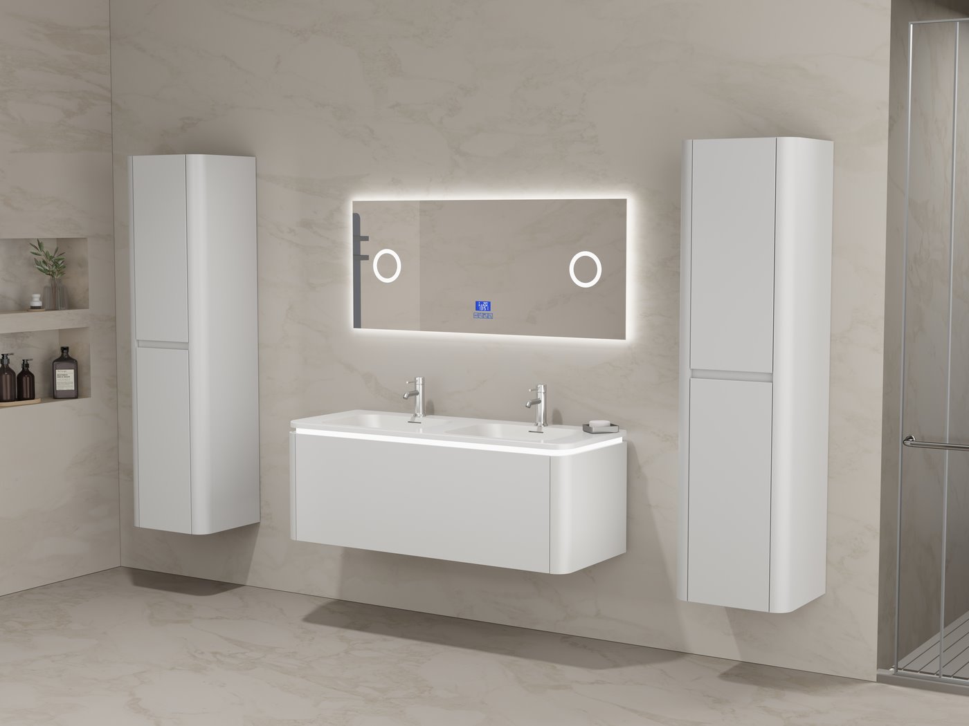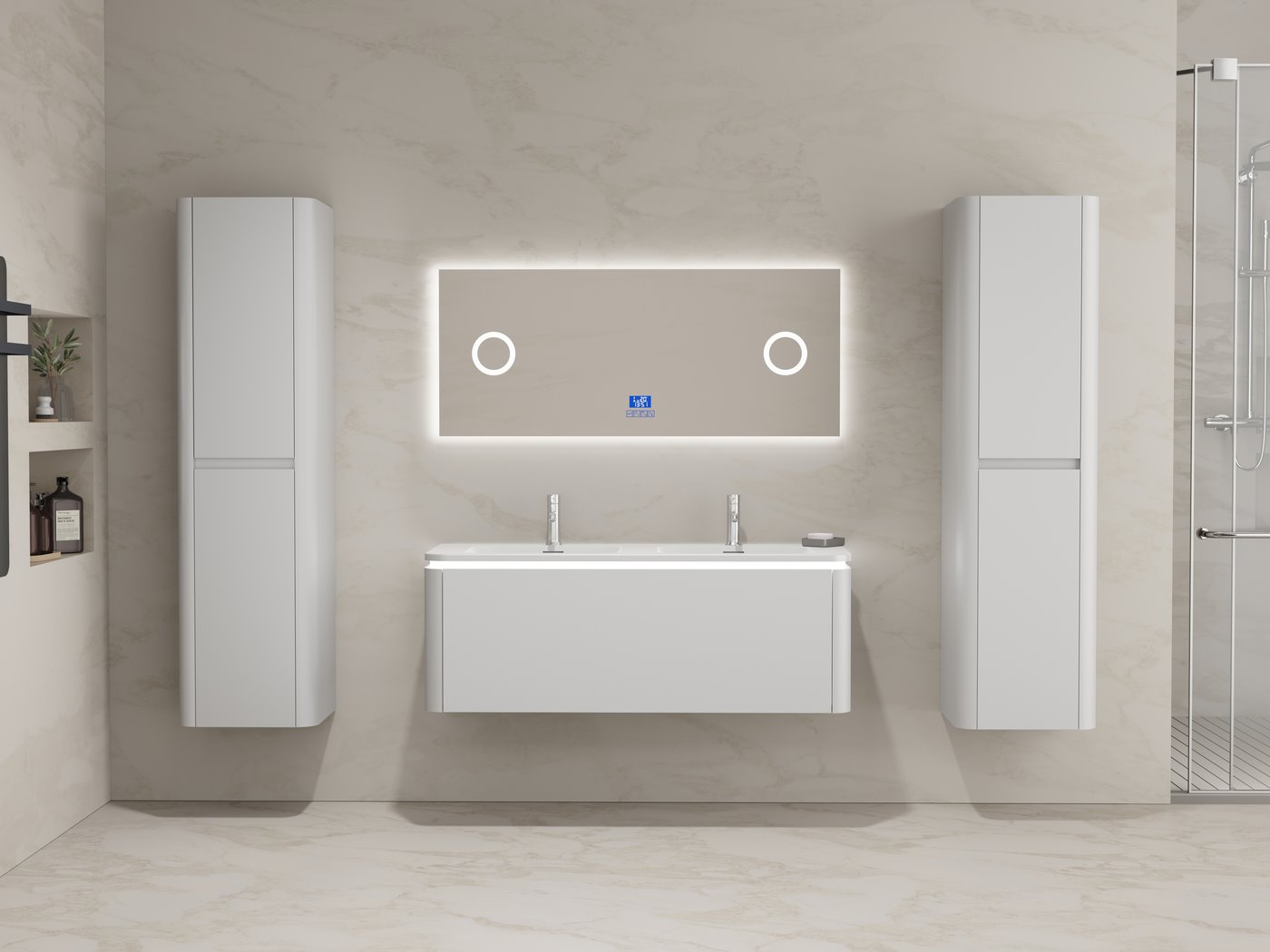 Aantal:1 <br /> Merk:Vonato <br /> Type:BOSTON1201-WH <br /> Model:Badkamermeubel 2 persoons 120 cm <br /> Kranen:Incl. 2 kranen <br /> Materiaal:Melamine en MDF <br /> Afmetingen Complete set: <br /> 1 * Wastafelmeubel - 1200x455x400mm, <br /> 1 * Dubbele wasbak - 1205x460x190mm, <br /> 2 * Zijkast - 1500x350x350mm, <br /> 1 * Spiegel - 1200x600mm <br /> <br /> Kleur:Wit <br /> Voorzien van:LED verlichting in onderkast - 2 kranen inclusief pop-up afvoer - 1 lade met 2 opbergvakken - Softclose lade systeem - LED spiegel met anti-fog systeem - Voorgemonteerde zijkasten en wastafelmeubel <br /> <br /> Conditie:Nieuw