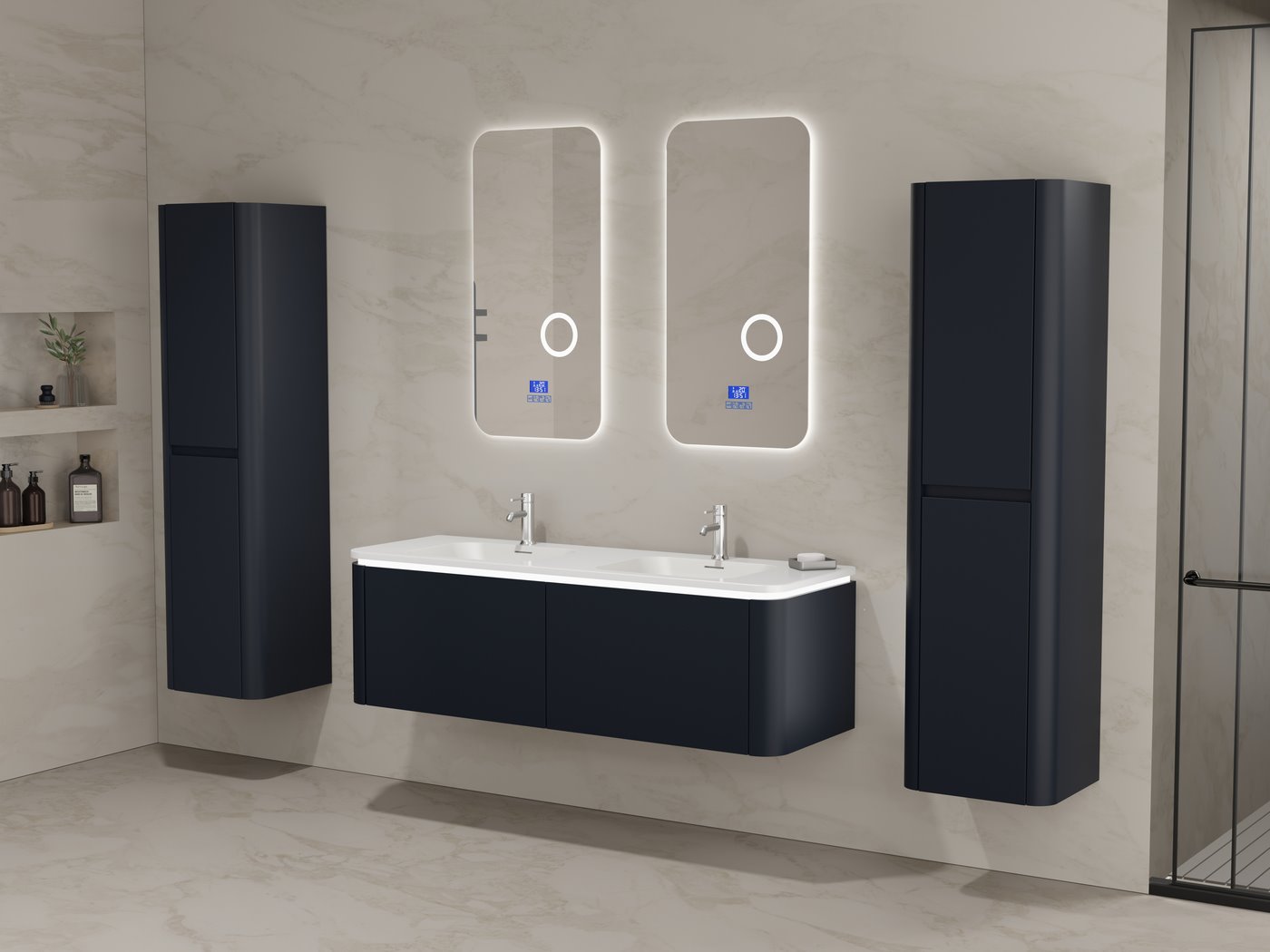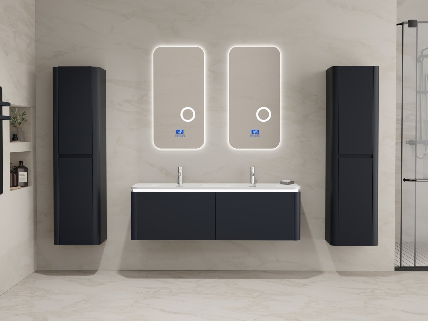 Aantal:1 <br /> Merk:Vonato <br /> Type:BOSTON1402-BL <br /> Model:Badkamermeubel 2 persoons 140 cm <br /> Kranen:Incl. 2 kranen <br /> Materiaal:Melamine en MDF <br /> Afmetingen Complete set: <br /> 1 * Wastafelmeubel - 1400x455x400mm <br /> 1 * Dubbele wasbak - 1405x460x190mm <br /> 2 * Zijkast - 1500x350x350mm <br /> 2 * Spiegel - 450x900mm <br /> Kleur:Zwart <br /> Voorzien van:LED verlichting in onderkast - 2 kranen inclusief pop-up afvoer – 2 lades - Softclose lade systeem – 2 LED spiegels met anti-fog systeem - Voorgemonteerde zijkasten en wastafelmeubel <br /> <br /> Conditie:Nieuw