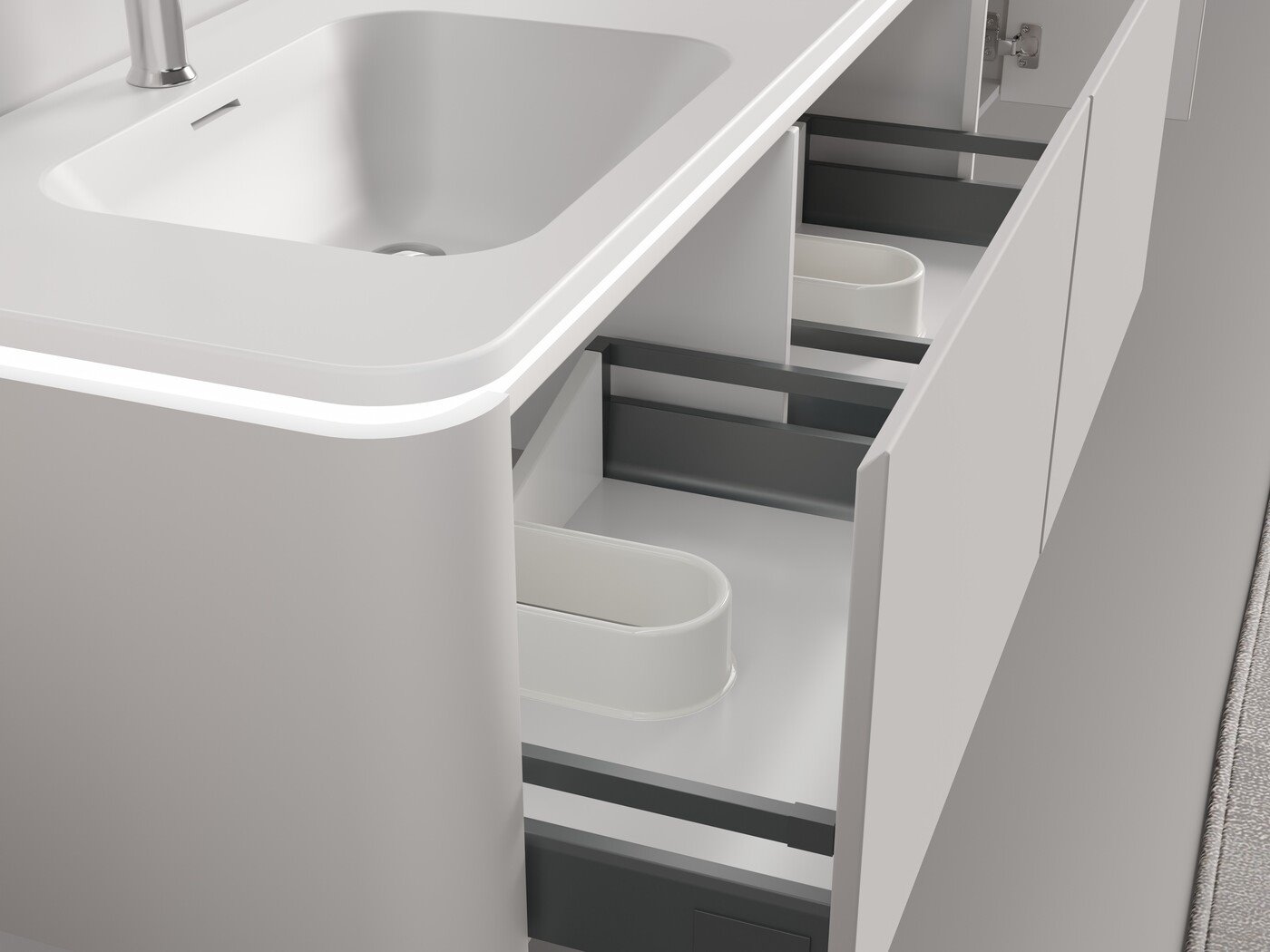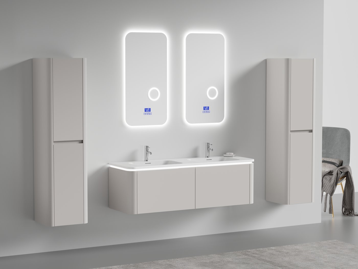 Aantal:1 <br /> Merk:Vonato <br /> Type:BOSTON1402-TA <br /> Model:Badkamermeubel 2 persoons 140 cm <br /> Kranen:Incl. 2 kranen <br /> Materiaal:Melamine en MDF <br /> Afmetingen Complete set: <br /> 1 * Wastafelmeubel - 1400x455x400mm <br /> 1 * Dubbele wasbak - 1405x460x190mm <br /> 2 * Zijkast - 1500x350x350mm <br /> 2 * Spiegel - 450x900mm <br /> Kleur:Taupe <br /> Voorzien van:LED verlichting in onderkast - 2 kranen inclusief pop-up afvoer – 2 lades - Softclose lade systeem – 2 LED spiegels met anti-fog systeem - Voorgemonteerde zijkasten en wastafelmeubel <br /> <br /> Conditie:Nieuw