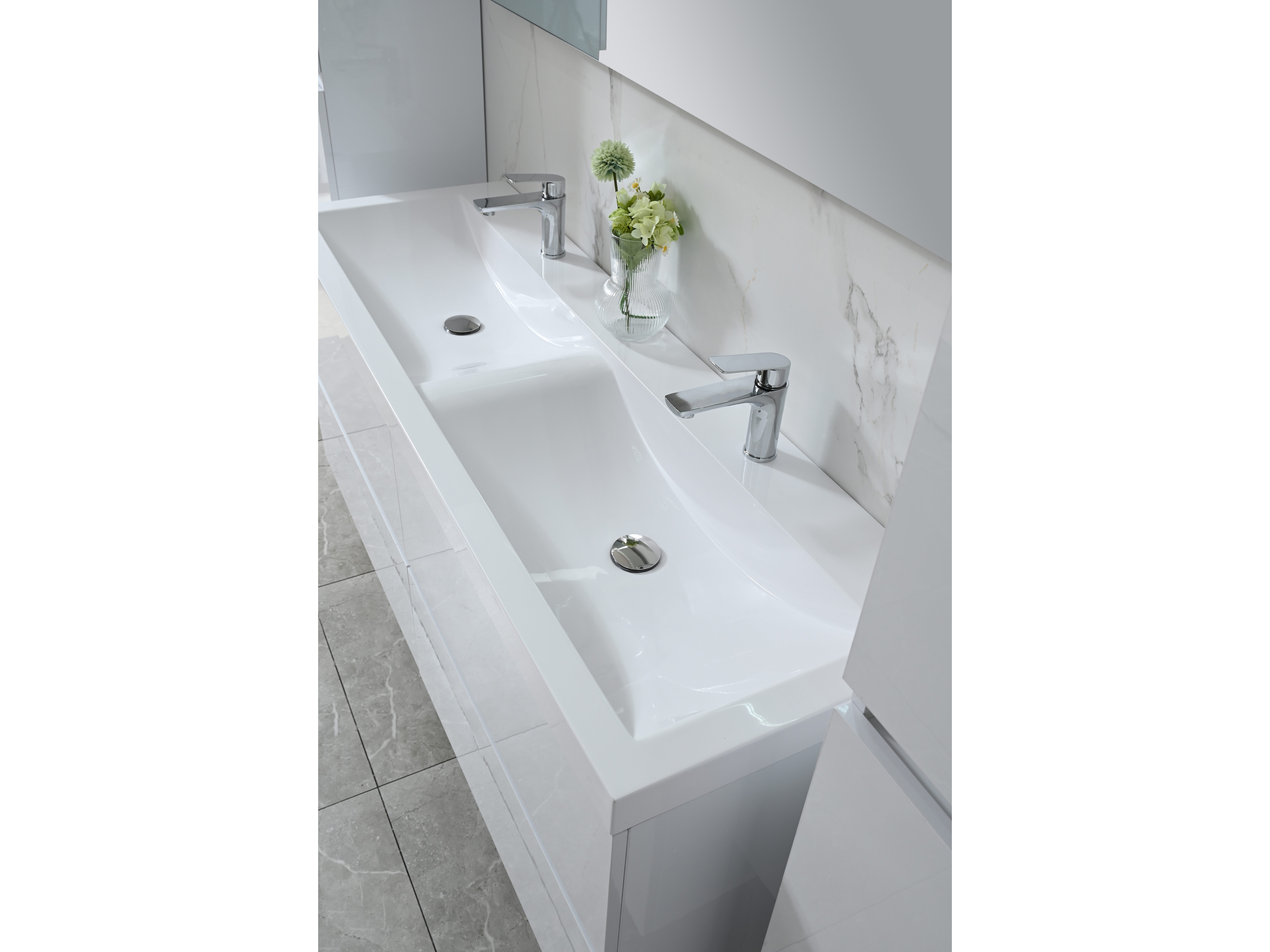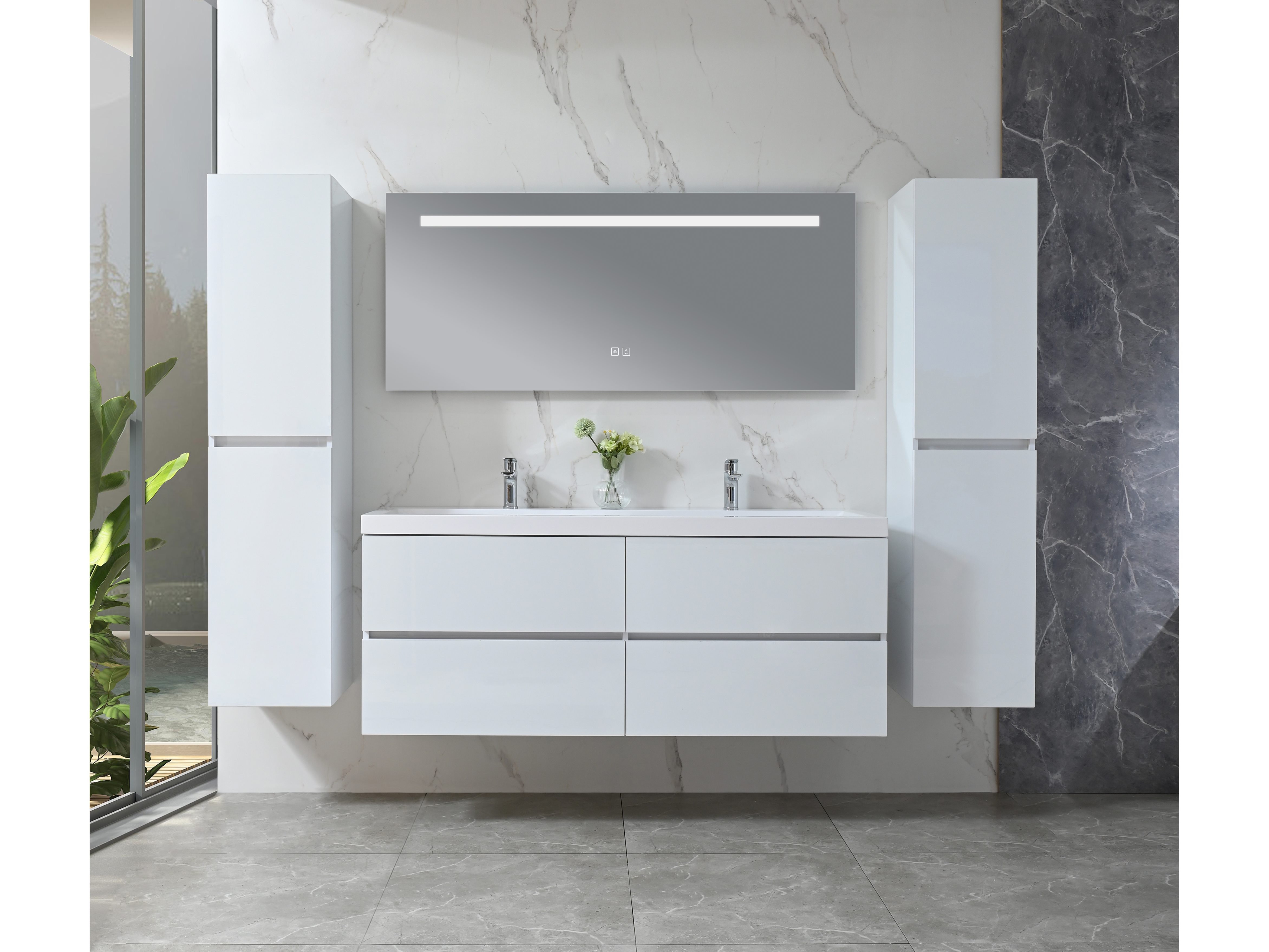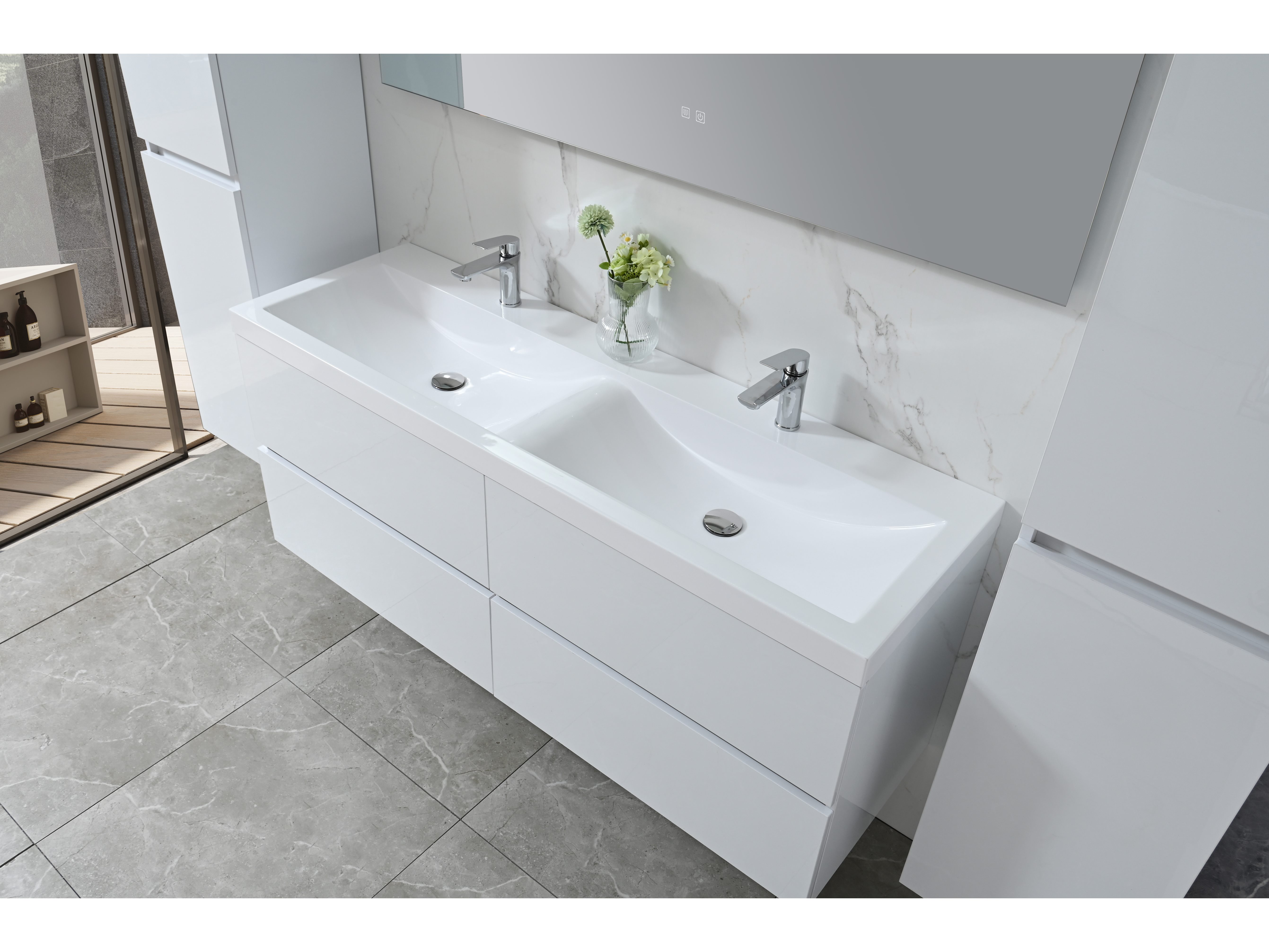 Aantal:1 <br /> Merk:Vonato <br /> Productnaam:Badkamermeubel 2 persoons <br /> Type:Havika S-WH <br /> Model:4-delig met dubbele wasbak <br /> Kleur:Hoogglans wit, witte wastafel <br /> Materiaal:Melamine, kunstmarmeren wastafel <br /> Afmeting:4-delige set: <br /> 1 * Wastafelmeubel - 1450x475x500mm <br /> 2 * Zijkast - 1500x350x350mm <br /> 1 * Spiegel - 1450x600mm <br /> <br /> Voorzien van:Kranen inclusief pop-up afvoer – 4 stevige metalen lades - Softclose lade systeem - LED spiegel met anti-fog systeem - Voorgemonteerde zijkast en wastafelmeubel <br /> <br /> Conditie:Nieuw
