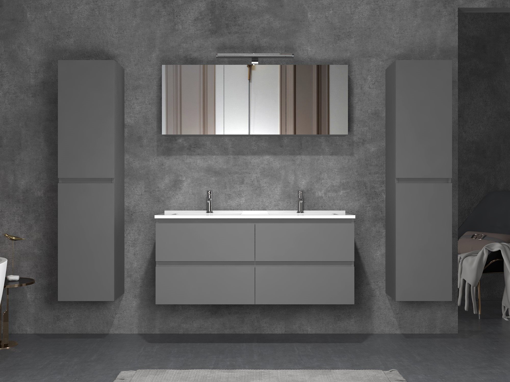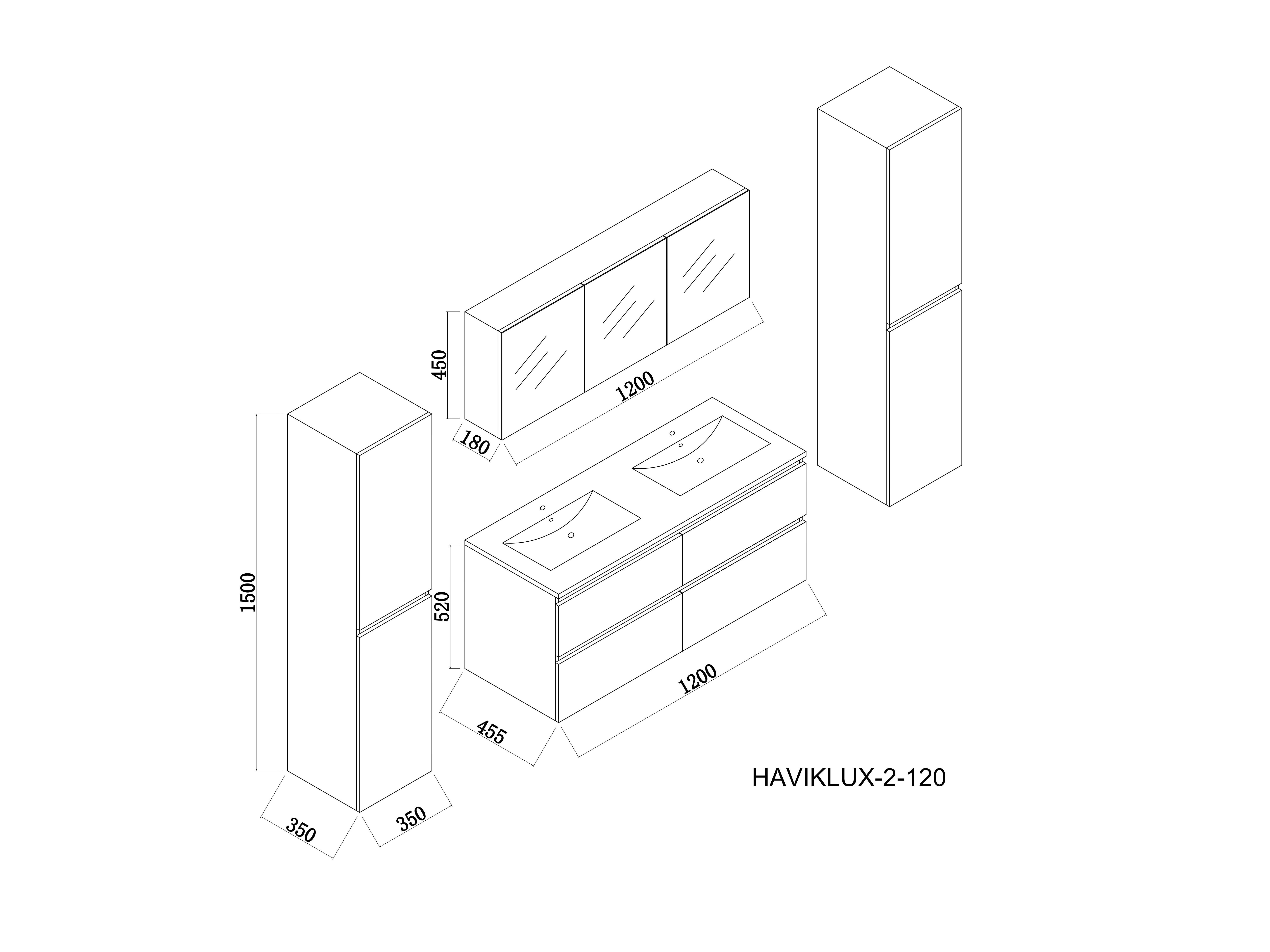 Aantal:1 <br /> Merk:Vonato <br /> Productnaam:Badkamermeubel <br /> Type:HAVIKLUXWM-2-120-ANT <br /> Model:2-persoons badkamermeubel 120 cm <br /> Kranen:Inclusief 2 kranen <br /> Materiaal: 18 mm MFC <br /> Afmetingen 2 persoons set:<br /> 1 x Wastafelmeubel - 1200x455x520mm <br /> 1 x Dubbele wasbak – 1200x460x160mm (rand 2 cm) <br /> 2 x Zijkasten - 1500x350x350mm <br /> 1 x Spiegelkast - 1200x450x180mm <br /> <br /> Kleur:Hoogglans wit <br /> Voorzien van: Kranen inclusief pop-up afvoer – 4 lades - Softclose systeem op deurtjes en lades - Giethars wasbakken – LED verlichting boven de spiegel – Spiegelkast met 3 deurtjes en 2 planken - Voorgemonteerde zijkasten en wastafelmeubel. <br /> <br /> Conditie: Nieuw