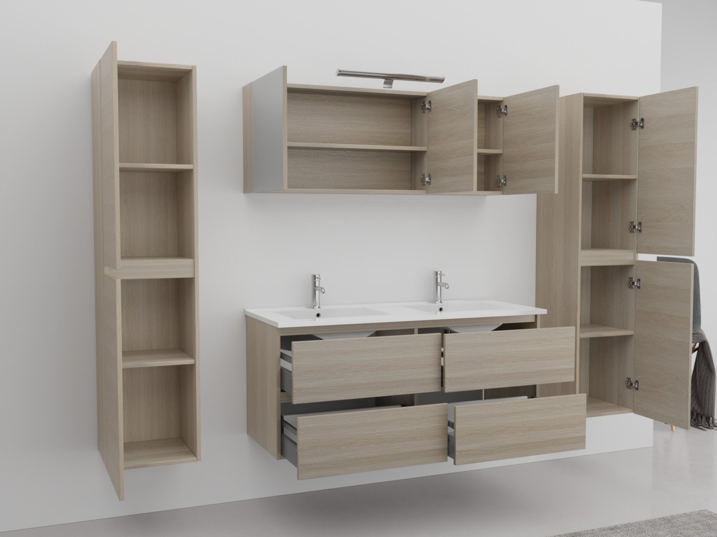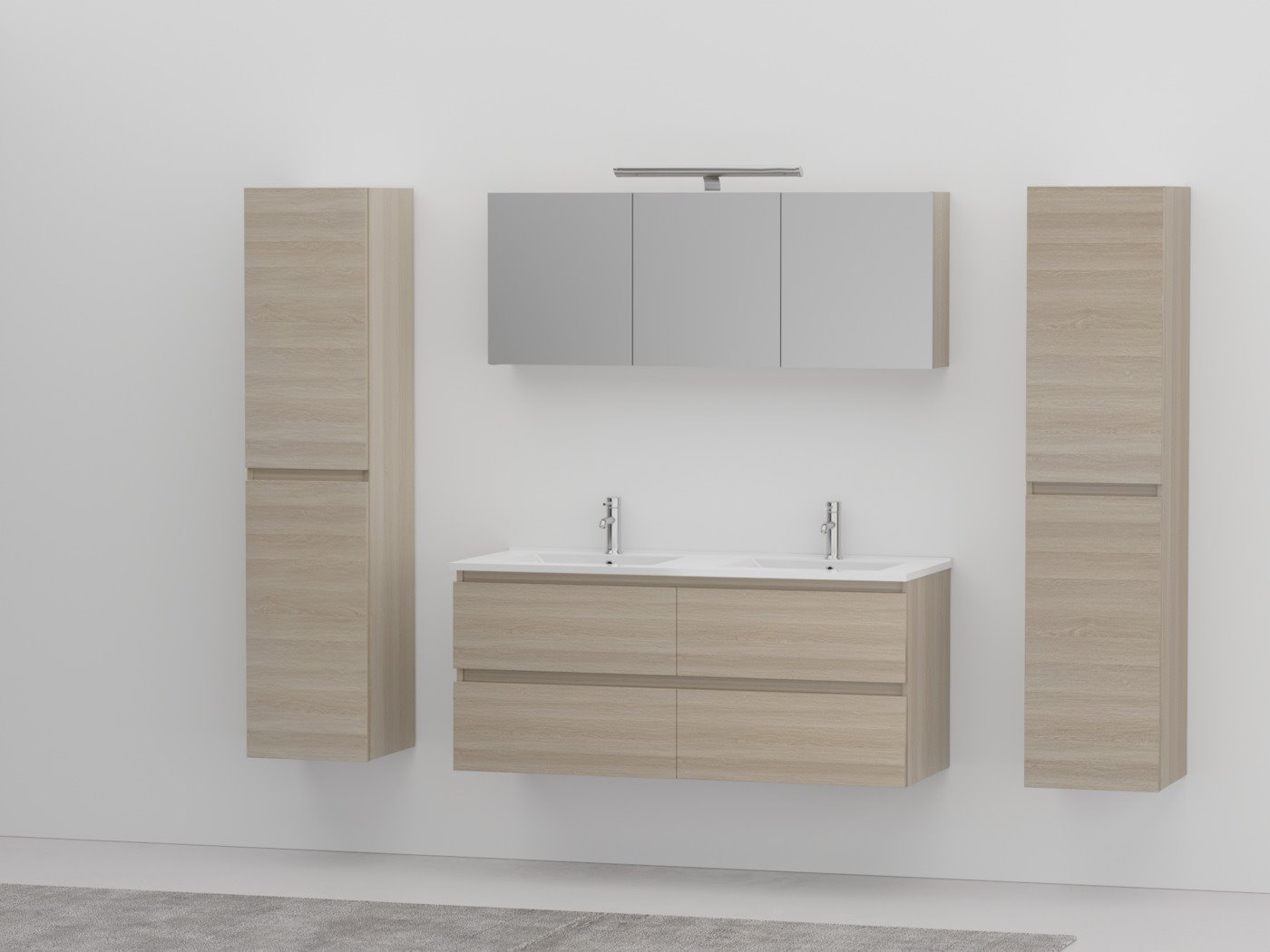 Aantal:1 <br /> Merk:Vonato <br /> Productnaam:Badkamermeubel <br /> Type:HAVIKLUXWM-2-120-H074 <br /> Model:2-persoons badkamermeubel 120 cm <br /> Kranen:Inclusief 2 kranen <br /> Materiaal: 18 mm MFC <br /> Afmetingen 2 persoons set:<br /> 1 x Wastafelmeubel - 1200x455x520mm <br /> 1 x Dubbele wasbak – 1200x460x160mm (rand 2 cm) <br /> 2 x Zijkasten - 1500x350x350mm <br /> 1 x Spiegelkast - 1200x450x180mm <br /> <br /> Kleur:Licht hout decor <br /> Voorzien van: Kranen inclusief pop-up afvoer – 4 lades - Softclose systeem op deurtjes en lades - Giethars wasbakken – LED verlichting boven de spiegel – Spiegelkast met 3 deurtjes en 2 planken - Voorgemonteerde zijkasten en wastafelmeubel. <br /> <br /> Conditie: Nieuw