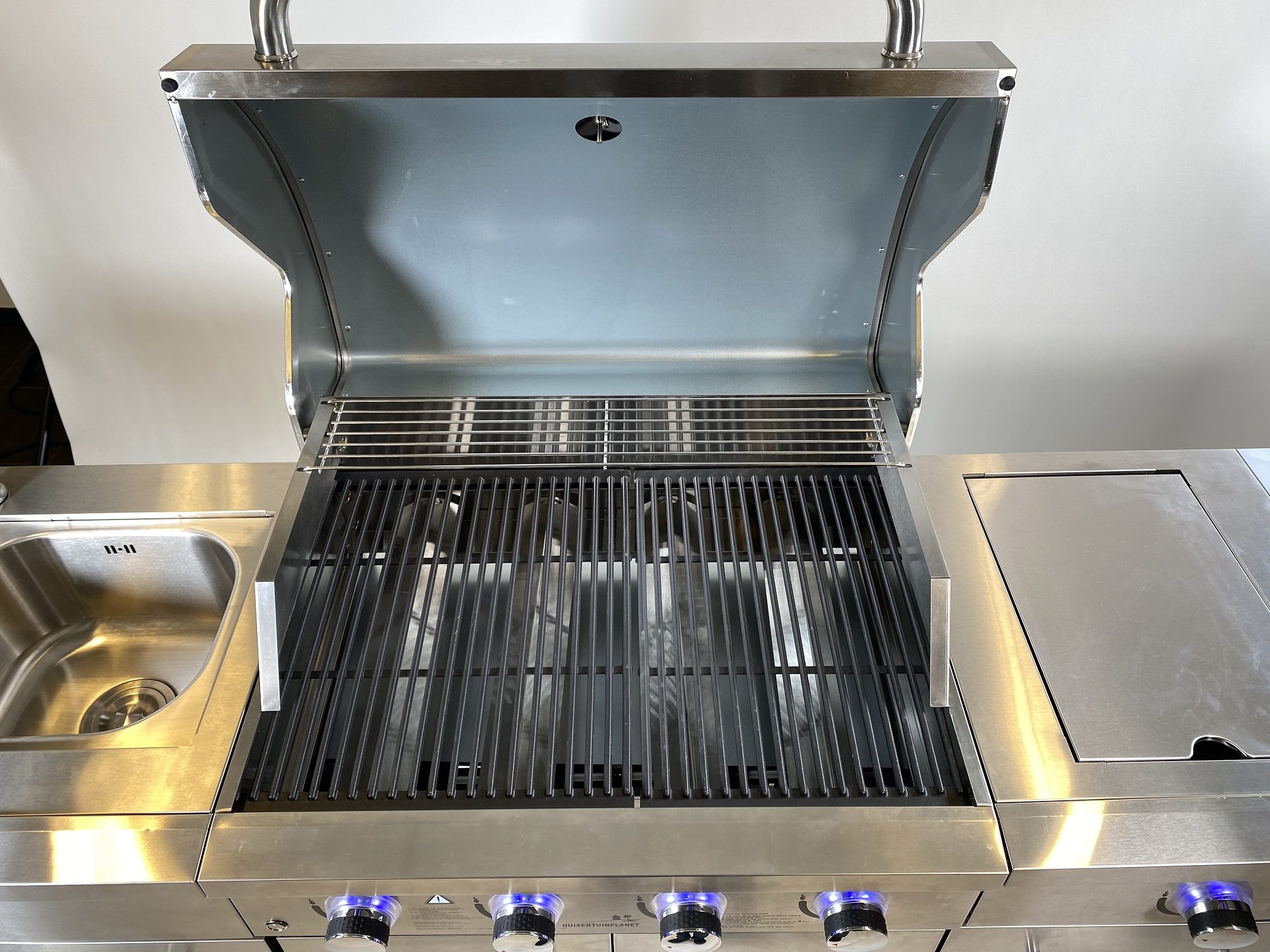 Aantal:1 <br /> Merk:Vonato <br /> Productnaam:Gasbarbecue keuken <br /> Type:JS-K004 <br /> Model:RVS Gasbarbecue - 4 branders, 1 zijbrander <br /> Kleur:Mat geborsteld RVS - Hoogglans details (zilverkleurig) <br /> Afmeting:2490x550x1200mm <br /> Grilloppervlakte:730x490mm <br /> Gewicht:69 Kg. <br /> Voorzien van:4 Hoofdbranders, 1 zijbrander - Wasbak met kraan - Gietijzeren roosters met warmhoudrek en leklade - LED verlichting - Elektrische ontsteking - Deksel voorzien van thermometer - Verrijdbaar. <br /> <br /> Conditie: Nieuw <br /> Ter waarde van: € 2.495,00