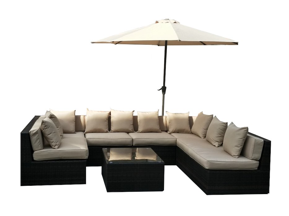 Aantal:1 <br /> Merk:Vonato <br /> Productnaam:Loungeset <br /> Type:ESR2009 <br /> Model:8-delig <br /> Kleur:Bruin wicker met zandkleurige kussens <br /> Afmeting:8-delige set: <br /> 3 * Middendeel - 700x800x660mm <br /> 2 * Hoekdeel - 800x800x660mm <br /> 1 * Lange bank - 1200x800x660mm <br /> 1 * Salontafel - 700x700x350mm - Helder glazen tafelblad <br /> 1 * Parasol - 2500x2500x2150mm <br /> <br /> Frame:Gepoedercoat aluminium frame - garandeert een langere levensduur <br /> Voorzien van:Waterafstotende kussens - weerbestendig vlechtwerk - 10 kussentjes voor extra comfort <br /> <br /> Conditie: Nieuw <br /> Ter waarde van: € 2.795,00
