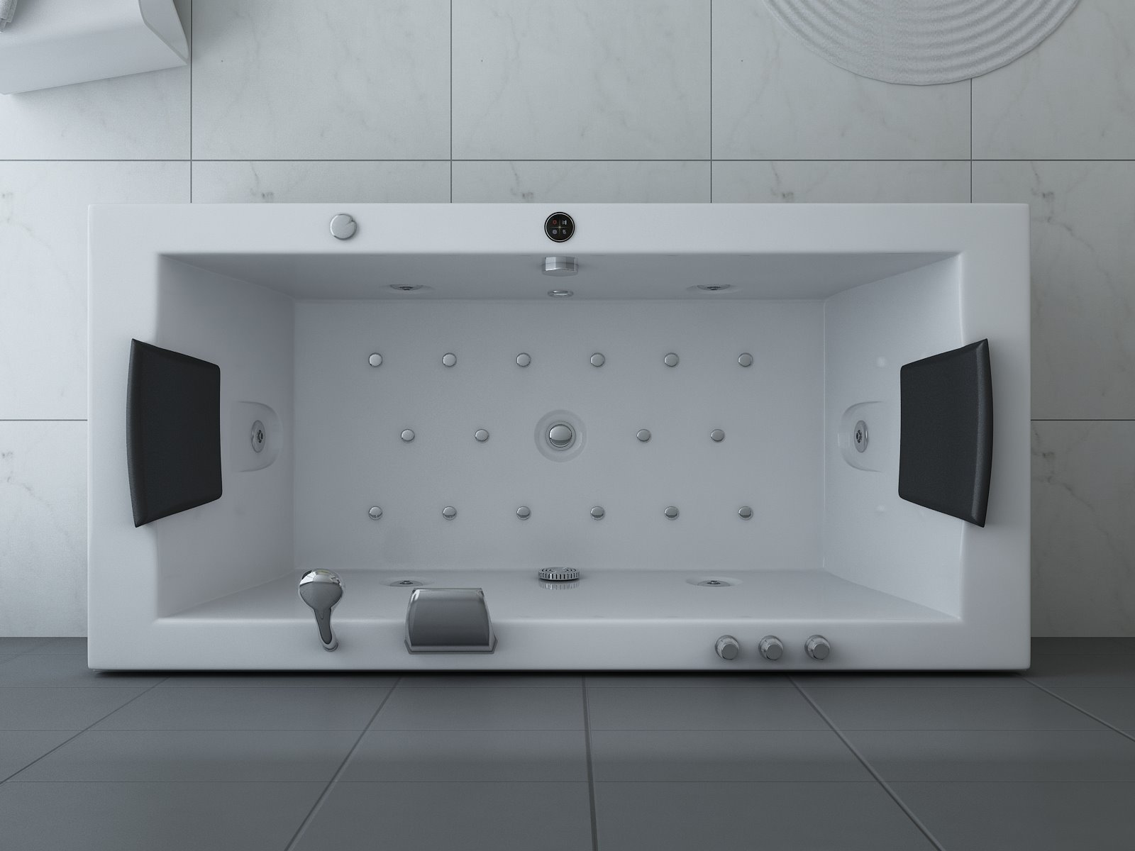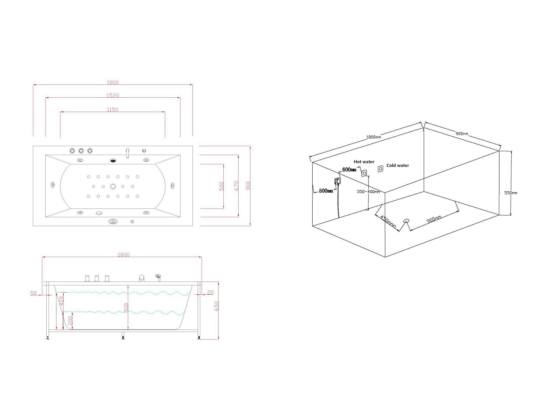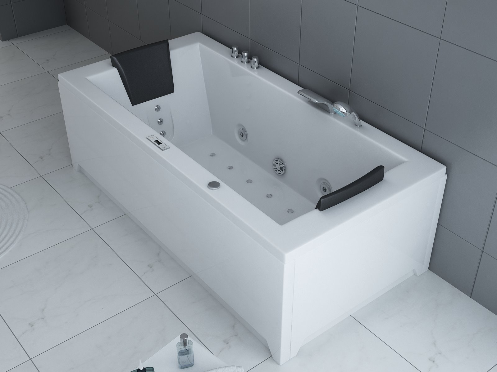 Aantal:1 <br /> Merk:Vonato <br /> Productnaam:Massagebad <br /> Type:RT1802.1BM.OB <br /> Model:Half vrijstaand <br /> Afmeting:1830x900x720mm <br /> Kleur:Hoogglans wit <br /> Waterjets:4 Grote waterjets en 16 airbubble jets. <br /> Voorzien van:Gegalvaniseerd stalen frame - Computer panel - Handdouche - 2 Hoofdkussens - LED-verlichting (7 stuks) - Luchtpomp - Verchroomd RVS Kraan/ waterval. Heater, Ozone, Thermostatische kraan <br /> <br /> Conditie: Nieuw <br /> Ter waarde van: € 4.295,00