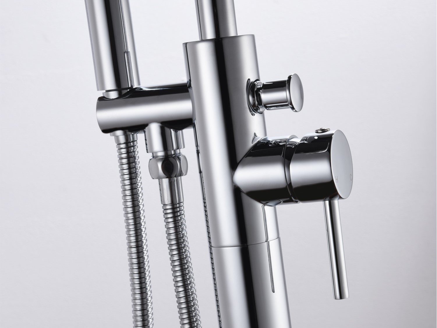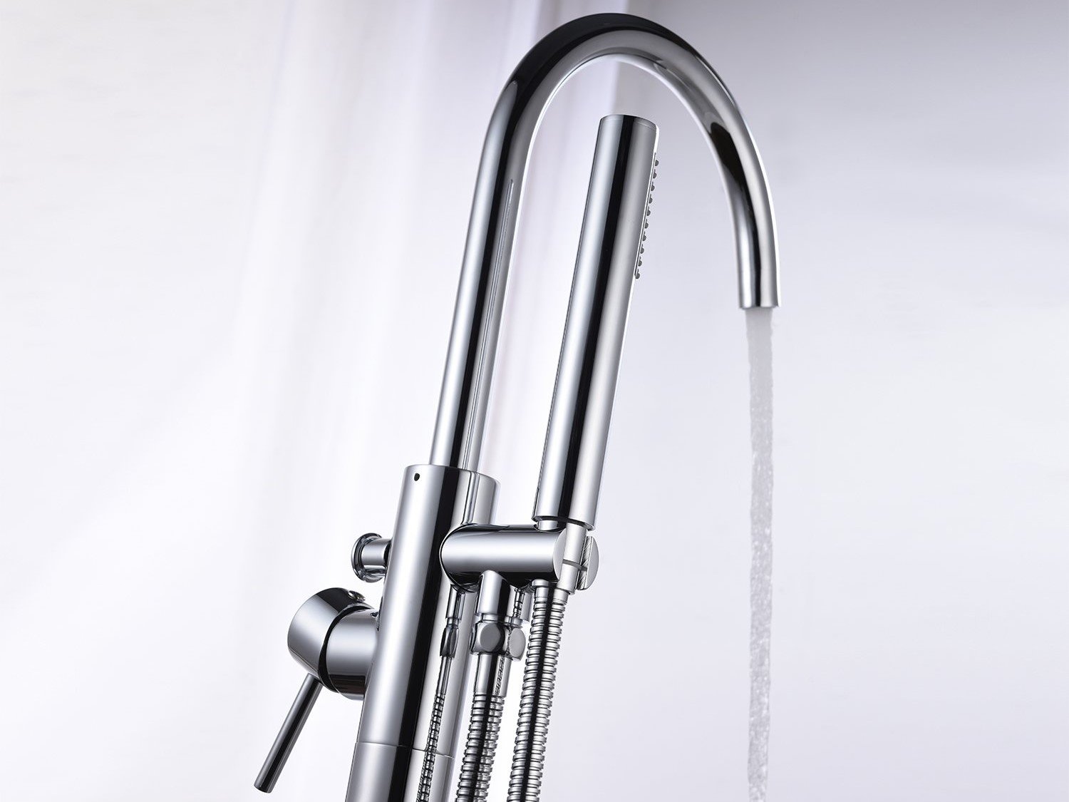 Aantal:1 <br /> Merk: Vonato <br /> Productnaam:Vrijstaande badkraan <br /> Type: FAUCET CHROME <br /> Model:Vrijstaand <br /> Kleur:Zilver (chroom) <br /> Afmetingen: De kraan is 111 cm hoog en de breedte is ca. 25 cm. <br /> Voorzien van: Uitneembare handdouche - Buis, handdouche en beugel van messing - 360 graden draaibare uitloop <br /> <br /> Conditie: Nieuw <br /> Ter waarde van: € 795,00
