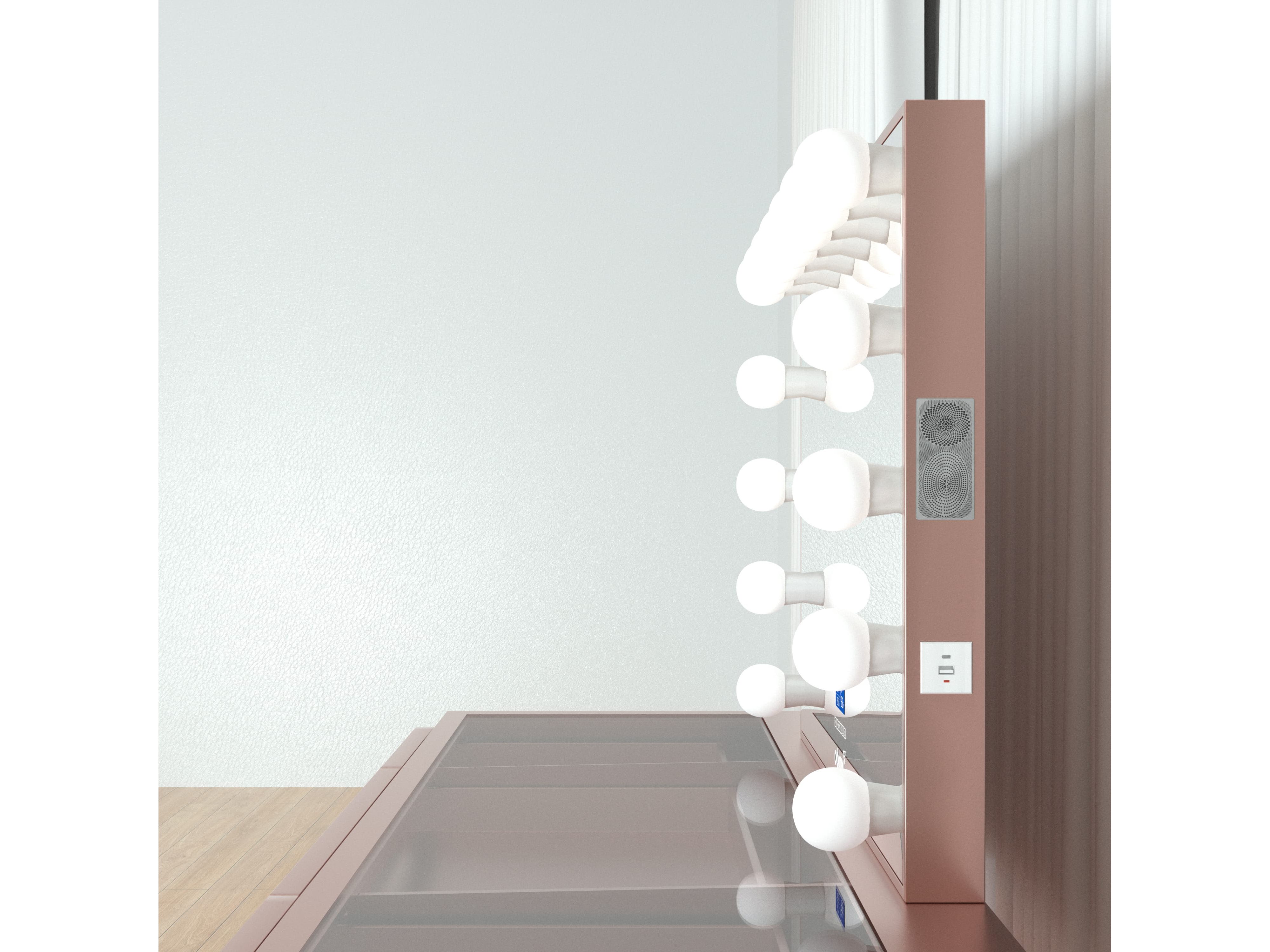 Aantal:1 <br /> Merk:Vonato <br /> Productnaam:Kaptafel <br /> Type:LG010-RG <br /> Model:Kaptafel met spiegel en kruk <br /> Kleur:Hoogglans roze <br /> Verlichting:15 stuks, 12V <br /> Materiaal:Geverfd MDF, gehard glazen blad <br /> Afmeting:complete set: <br /> 1 * Tafel: 1500x600x810mm <br /> 1 * Spiegel: 1000x800mm <br /> 1 * Kruk: 350x400mm <br /> Voorzien van: Verlichting met 3 standen – Touchbuttons – USB en type C aansluitingen – Muziek luisteren via Bluetooth functie - Helder gehard glazen tafelblad – 13 lades. <br /> <br /> Conditie:Nieuw