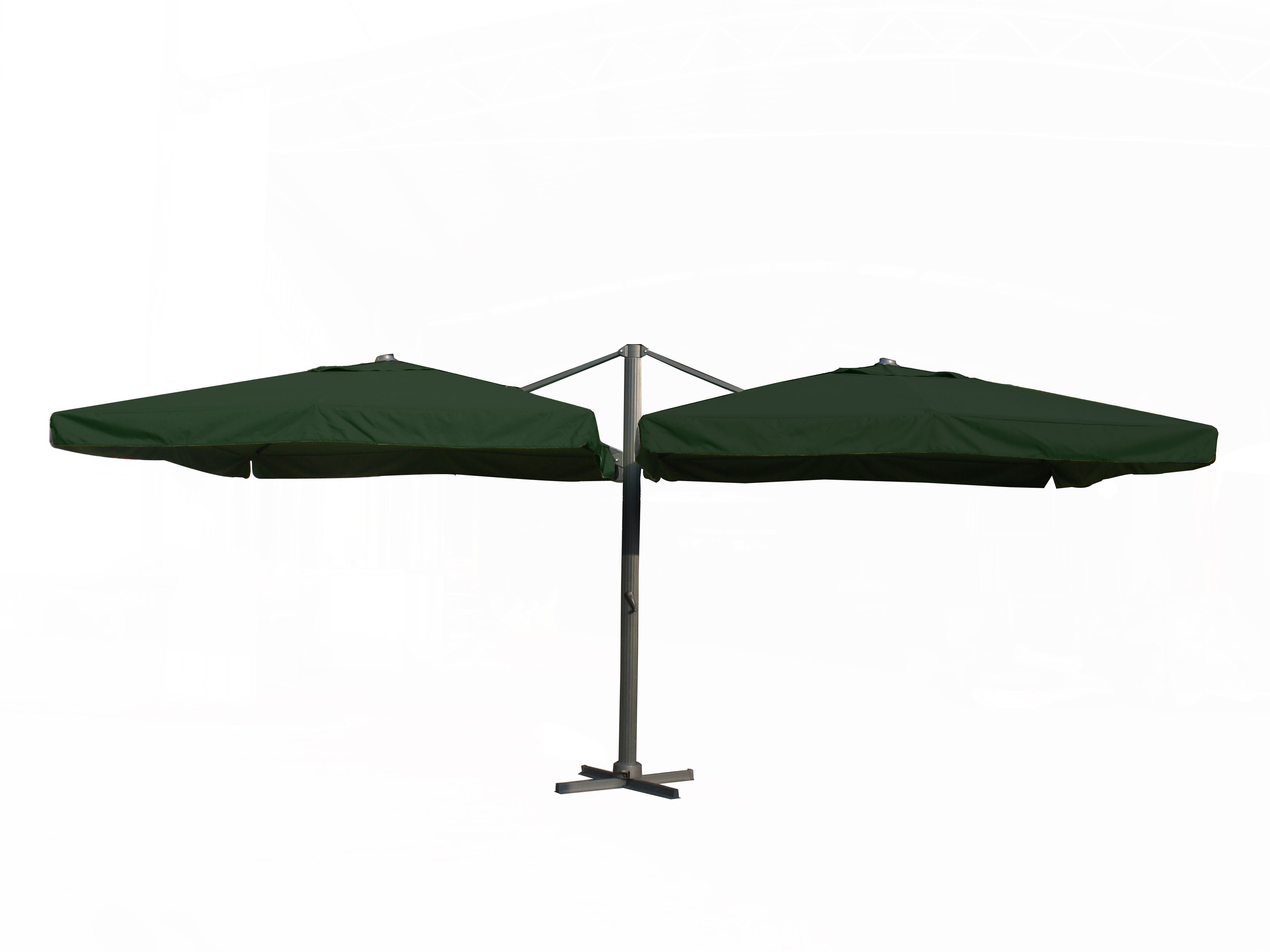 Aantal: 1 <br /> Merk: Vonato <br /> Productnaam: Parasol <br /> Type: U1073 DOUBLE 3X3 DARK GREEN <br /> Afmeting: 3000x3000mm <br /> Model: Dubbel hangend <br /> Kleur: Donkergroen <br /> Materiaal: Aluminium frame, 200 gram/m2 brandvertragend doek <br /> Productbeschrijving: De parasol is ideaal voor gebruik in de tuin, terras en balkon. De grote parasol wordt geleverd met een parasolvoet. Deze moet wel worden verzwaard met behulp van bijvoorbeeld terrastegels. Houd hiervoor minimaal een gewicht van 100 kilo aan. <br /> Voorzien van: Groot parasoldoek met een afmeting van 2x ø300 cm. - Sterk en stevig frame gemaakt van aluminium. <br /> - Eenvoudig startklaar te zetten voor gebruik. <br /> - Inclusief parasolvoet. <br /> - Brandvertragend, dik doek voor een betere UV-bescherming.<br /> - De parasol houdt de warmte van de zon vast waardoor het ook ’s avonds nog lekker warm is wanneer de zon ondergaat. <br /> - De parasol kan 360 graden om zijn as draaien, zo kan de parasol makkelijk meedraaien met de zon en maak je optimaal gebruik van de parasol. <br /> <br /> Conditie: Nieuw <br /> Ter waarde van: € 1.495,00