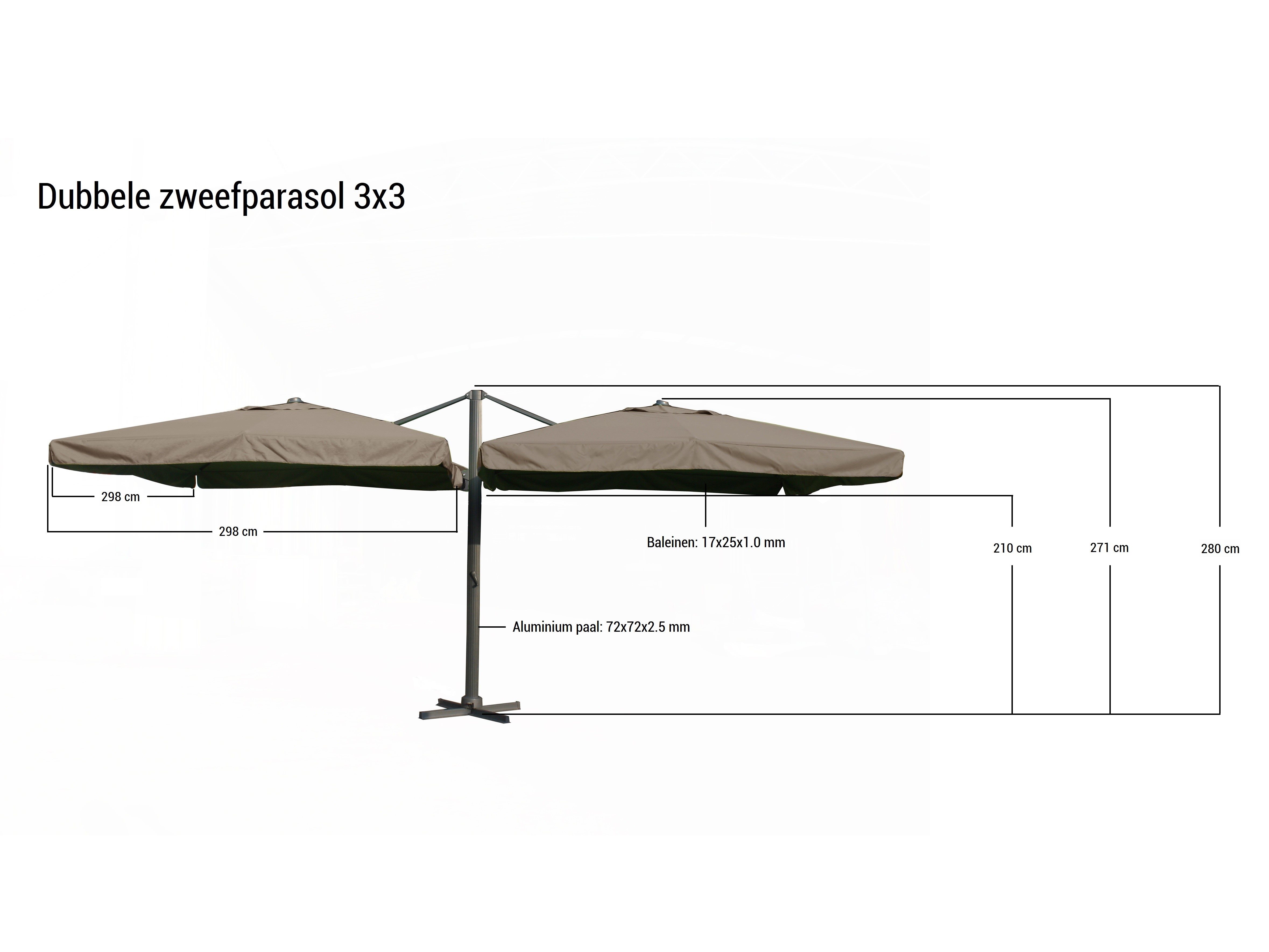 Aantal: 1 <br /> Merk: Vonato <br /> Productnaam: Parasol <br /> Type: U1073 DOUBLE 3X3 DARK GREY <br /> Afmeting: 3000x3000mm <br /> Model: Dubbel hangend <br /> Kleur: Donkergrijs <br /> Materiaal: Aluminium frame, 200 gram/m2 brandvertragend doek <br /> Productbeschrijving: De parasol is ideaal voor gebruik in de tuin, terras en balkon. De grote parasol wordt geleverd met een parasolvoet. Deze moet wel worden verzwaard met behulp van bijvoorbeeld terrastegels. Houd hiervoor minimaal een gewicht van 100 kilo aan. <br /> Voorzien van: Groot parasoldoek met een afmeting van 2x ø300 cm. - Sterk en stevig frame gemaakt van aluminium. <br /> - Eenvoudig startklaar te zetten voor gebruik. <br /> - Inclusief parasolvoet. <br /> - Brandvertragend, dik doek voor een betere UV-bescherming.<br /> - De parasol houdt de warmte van de zon vast waardoor het ook ’s avonds nog lekker warm is wanneer de zon ondergaat. <br /> - De parasol kan 360 graden om zijn as draaien, zo kan de parasol makkelijk meedraaien met de zon en maak je optimaal gebruik van de parasol. <br /> <br /> Conditie: Nieuw <br /> Ter waarde van: € 1.495,00