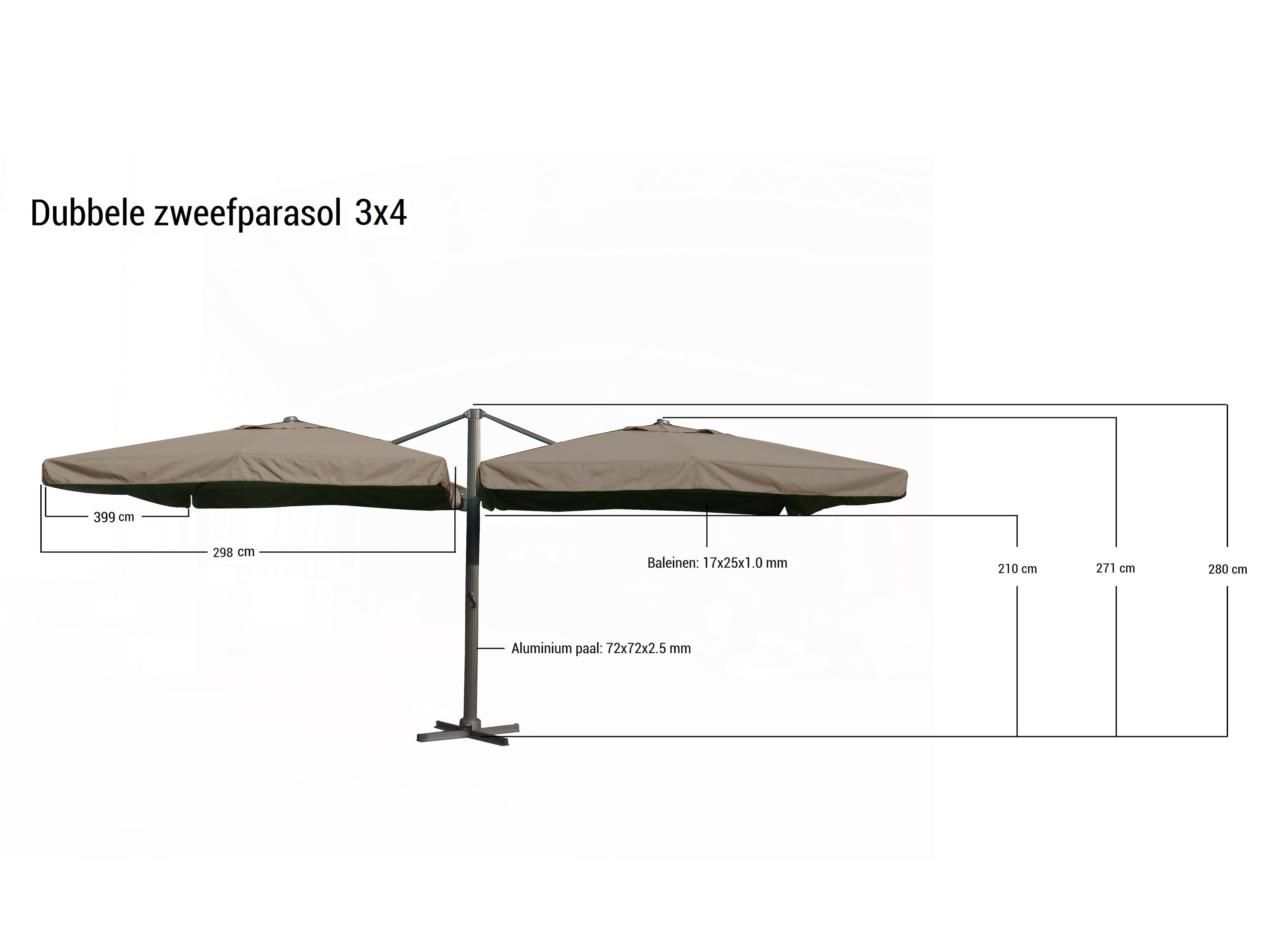 Aantal: 1 <br /> Merk: Vonato <br /> Productnaam: Parasol <br /> Type: U1073 DOUBLE 3X4 SANDY <br /> Afmeting: 2x 3000x4000mm (3000 mm breed, 4000 mm diep) <br /> Model: Dubbel hangend <br /> Kleur: Zandkleurig <br /> Materiaal: Aluminium frame, 200 gram/m2 brandvertragend doek <br /> Productbeschrijving: De parasol is ideaal voor gebruik in de tuin, terras en balkon. De grote parasol wordt geleverd met een parasolvoet. Deze moet wel worden verzwaard met behulp van bijvoorbeeld terrastegels. Houd hiervoor minimaal een gewicht van 100 kilo aan. <br /> Voorzien van: Groot dubbel parasoldoek met een afmeting van tweemaal 300x400 cm. - Sterk en stevig frame gemaakt van aluminium. <br /> - Eenvoudig startklaar te zetten voor gebruik. <br /> - Brandvertragend, dik doek voor een betere UV-bescherming.<br /> - De parasol houdt de warmte van de zon vast waardoor het ook ’s avonds nog lekker warm is wanneer de zon ondergaat. <br /> - De parasol kan 360 graden om zijn as draaien, zo kan de parasol makkelijk meedraaien met de zon en maak je optimaal gebruik van de parasol. <br /> <br /> Conditie: Nieuw <br /> Ter waarde van: € 1.695,00