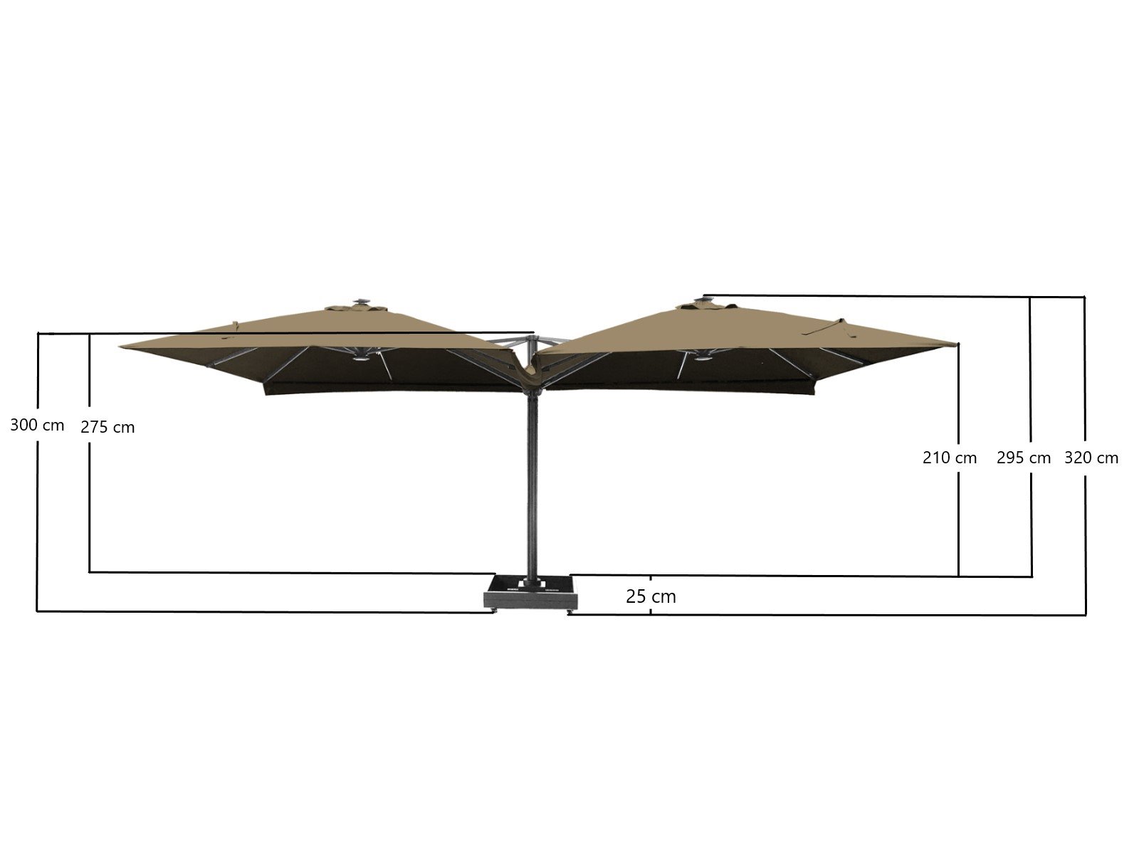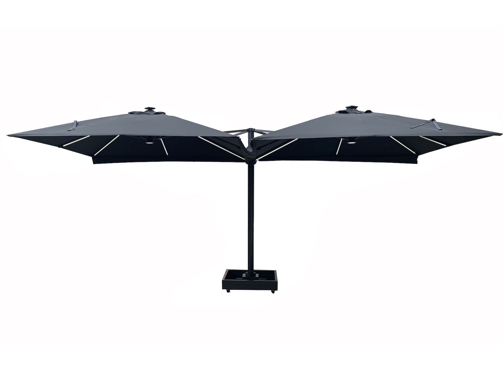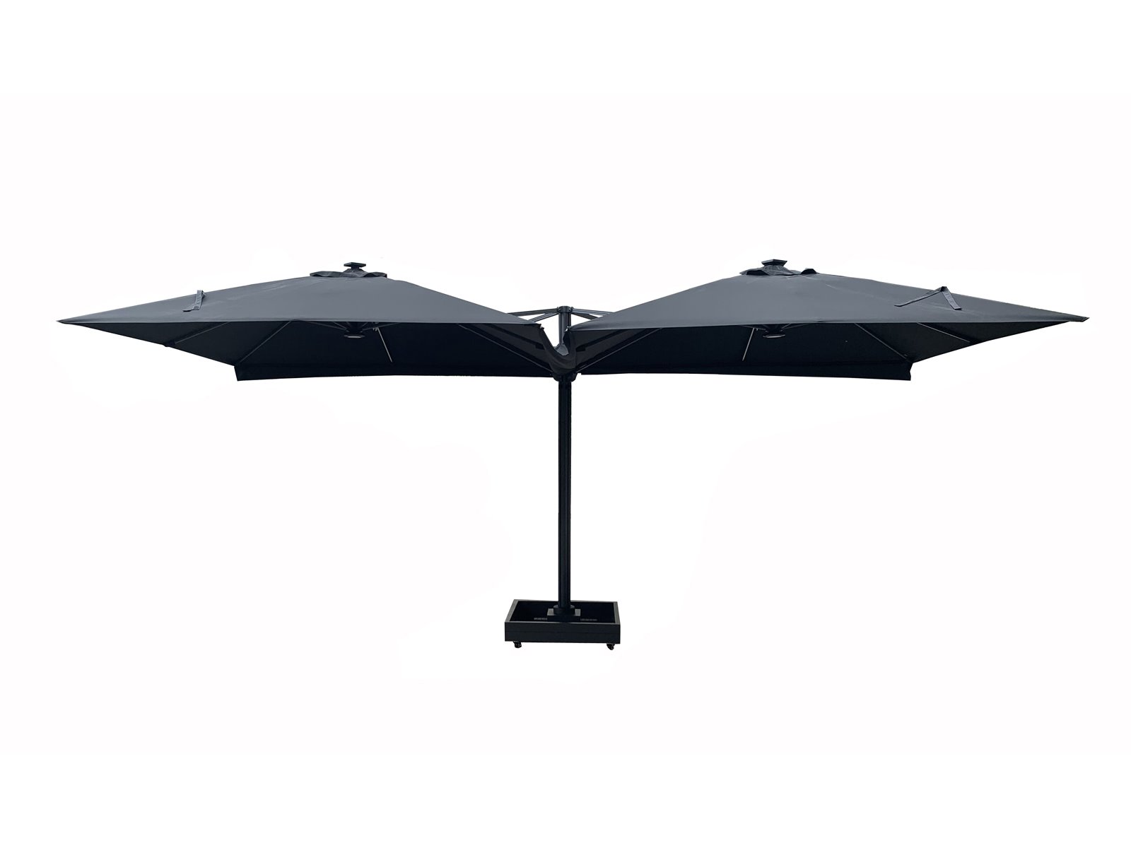 Aantal: 1 <br /> Merk: Vonato <br /> Productnaam: Parasol <br /> Type: U1075 QUATRE 3X3 DARKGREY <br /> Afmeting: 4x 3000x3000mm <br /> Model: Vierdubbel hangend <br /> Kleur: Donkergrijs <br /> Materiaal: Aluminium frame, 200 gram/m2 brandvertragend doek <br /> Productbeschrijving: De parasol is ideaal voor gebruik in de horeca en/of op een groot terras, tuin of binnenplaats. De parasol bestaat uit 4 parasols aan een frame en is voorzien van een grondanker. Exclusief verrijdbare parasolvoet: deze is los verkrijgbaar. <br /> Voorzien van: LED-verlichting onder het doek zodat het 's avonds ook nog goed vertoeven is onder de parasol. <br /> - Groot parasoldoek, 4 stuks, met een afmeting van ø300 cm. - Sterk en stevig frame gemaakt van aluminium. <br /> - Eenvoudig startklaar te zetten voor gebruik. <br /> - Brandvertragend, dik doek voor een betere UV-bescherming.<br /> - Ventilatie aan de bovenzijde van het doek.<br /> - De parasols zijn voorzien van een afritsbaar tussenstuk om de parasols te verbinden, zodat u altijd droog zit.<br /> <br /> <br /> Conditie: Nieuw <br /> Ter waarde van: € 4.495,00