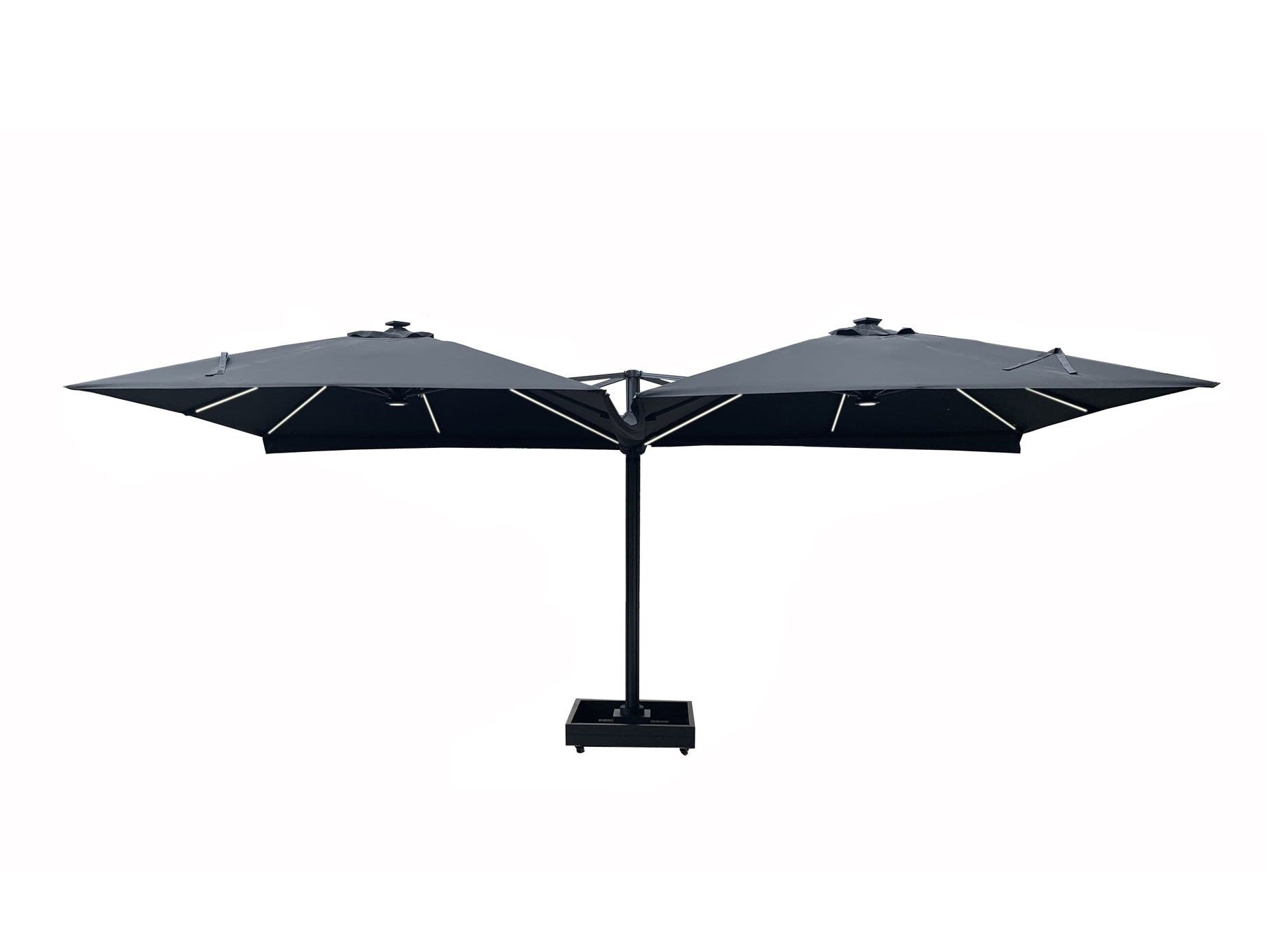 Aantal: 1 <br /> Merk: Vonato <br /> Productnaam: Parasol <br /> Type: U1075 QUATRE 3X3 TAUPE <br /> Afmeting: 4x 3000x3000mm <br /> Model: Vierdubbel hangend <br /> Kleur: Taupe <br /> Materiaal: Aluminium frame, 200 gram/m2 brandvertragend doek <br /> Productbeschrijving: De parasol is ideaal voor gebruik in de horeca en/of op een groot terras, tuin of binnenplaats. De parasol bestaat uit 4 parasols aan een frame en is voorzien van een grondanker. Exclusief verrijdbare parasolvoet: deze is los verkrijgbaar. <br /> Voorzien van: LED-verlichting onder het doek zodat het 's avonds ook nog goed vertoeven is onder de parasol. <br /> - Groot parasoldoek, 4 stuks, met een afmeting van ø300 cm. - Sterk en stevig frame gemaakt van aluminium. <br /> - Eenvoudig startklaar te zetten voor gebruik. <br /> - Brandvertragend, dik doek voor een betere UV-bescherming.<br /> - Ventilatie aan de bovenzijde van het doek.<br /> - De parasols zijn voorzien van een afritsbaar tussenstuk om de parasols te verbinden, zodat u altijd droog zit.<br /> <br /> <br /> Conditie: Nieuw <br /> Ter waarde van: € 4.495,00