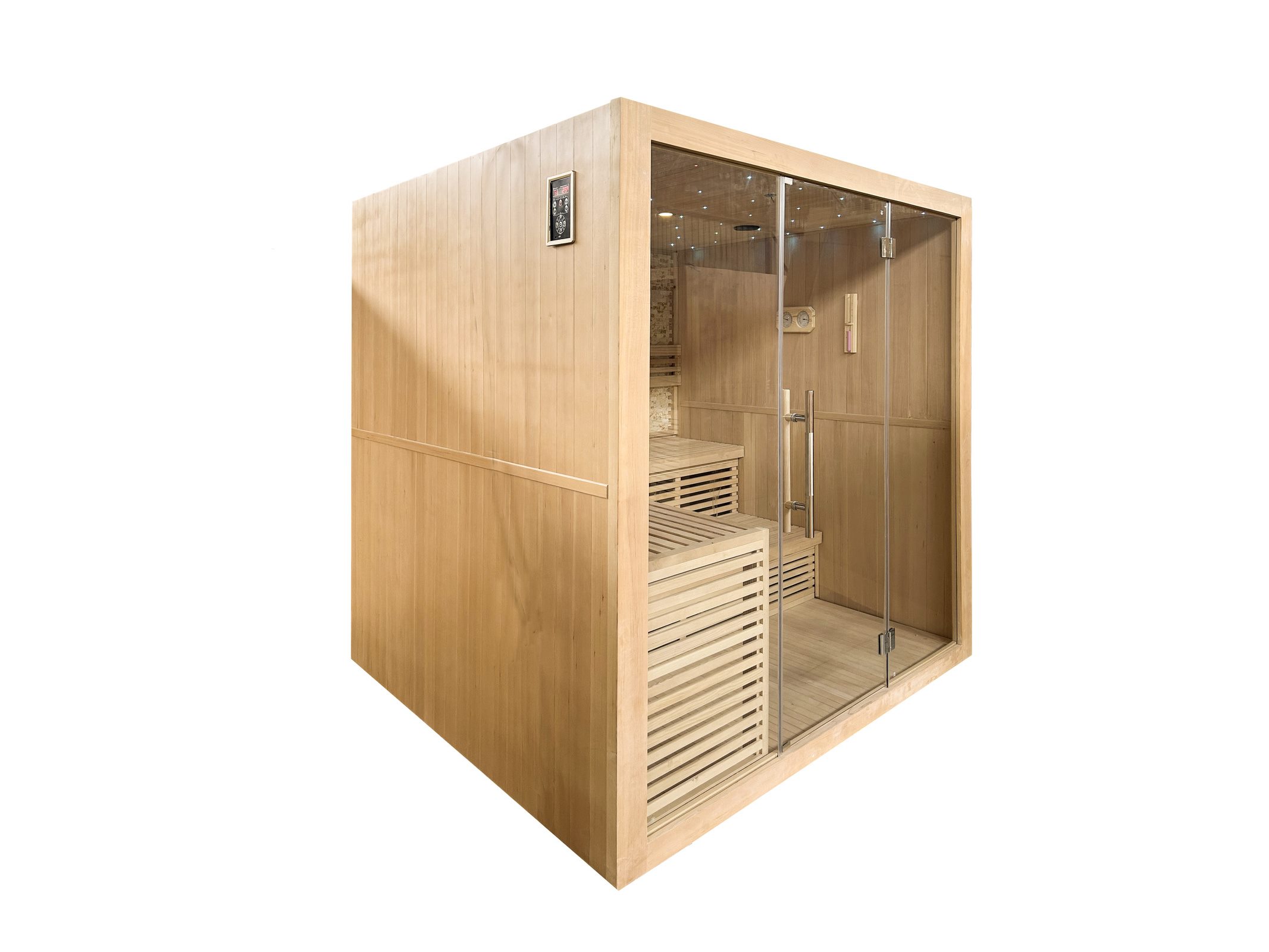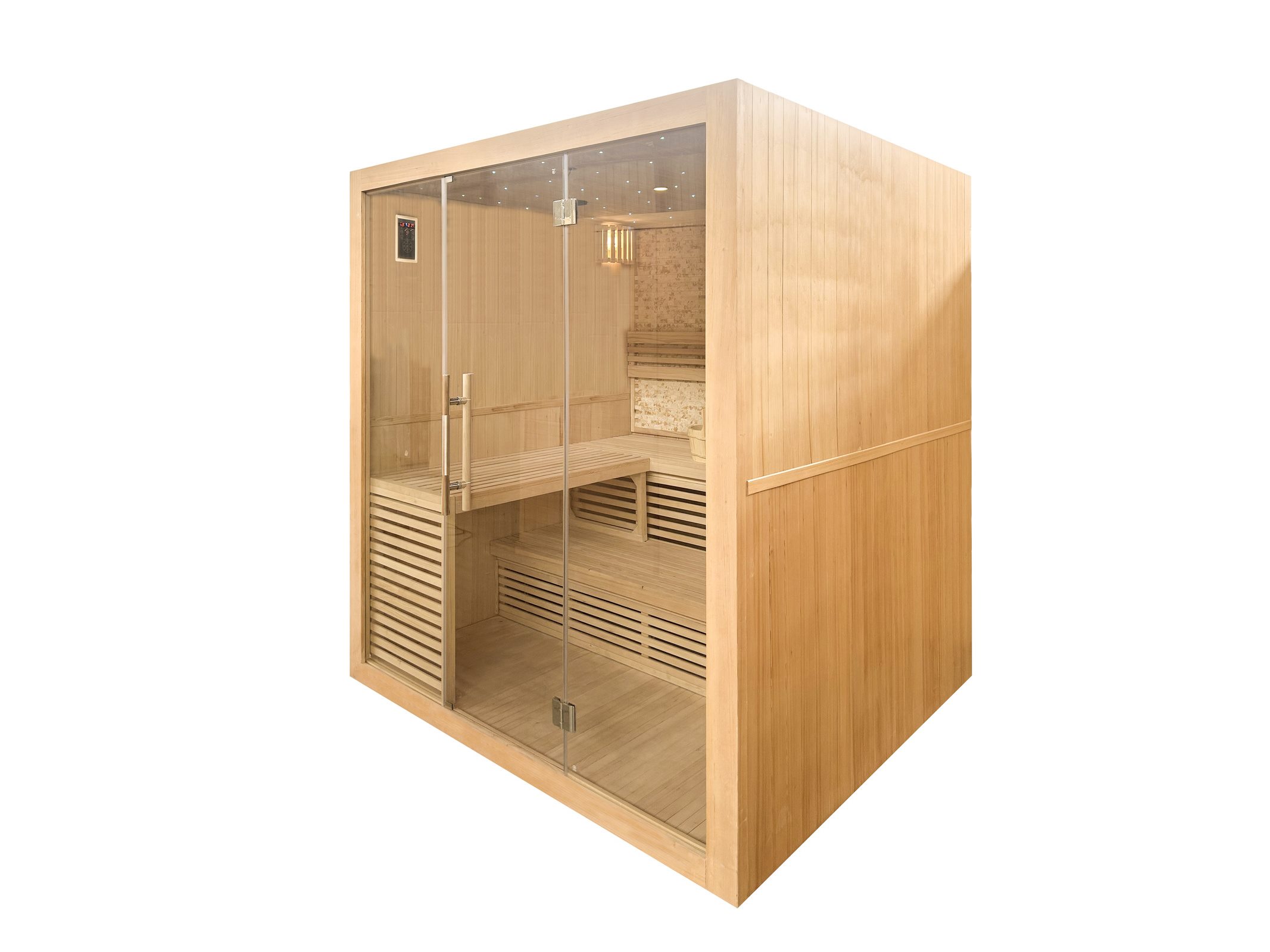 Aantal:1 <br /> Merk:Vonato <br /> Productnaam:Sauna Elec: 6Kw en 220 Volt <br /> Type:SMS-L102N <br /> Model:Kachel - rechthoekig <br /> Afmeting:2000x2000x2100mm <br /> Verwarming:Kachel (6kW) verwarmming tot 90 graden <br /> Details:Sterrenhemel sfeerverlichting - Achterwanden zijn voorzien van lichte natuurstenen strips <br /> Voorzien van:Sterrenhemel sfeerverlichting - Achterwanden zijn voorzien van lichte natuurstenen strips<br /> Voorzien van: Helder veiligheidsglas (8mm) - Hittebestendige deurknoppen - Ca. 20 kg. Lavastenen - Ventilatierooster - Touchscreen Control Panel - Bluetooth integratie voor muziek met dubbele speaker (eenvoudig te bedienen via de Control Panel) - Comfortabele zitbank - Houten emmer met scheplepel - Zandloper - Thermometer <br /> <br /> Conditie: Nieuw <br /> Ter waarde van: € 8.995,00
