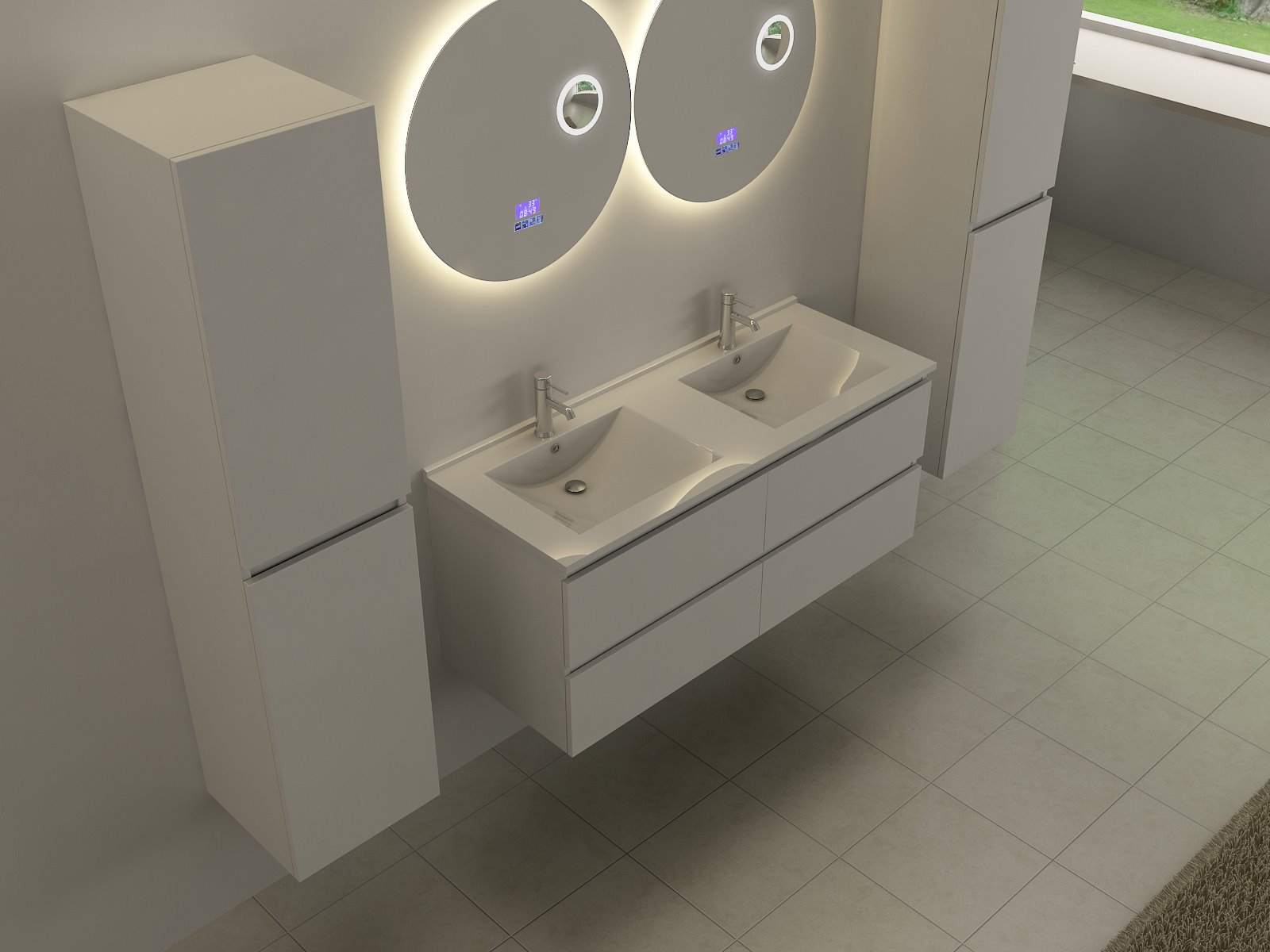Aantal:1 <br /> Merk:Vonato <br /> Productnaam: Badkamerspiegel <br /> Type: RNLM-60 <br /> Model:Ronde spiegel met LED verlichting <br /> Afmetingen: Ø60 cm, dikte: 0,5 cm <br /> Kleur: LED verlichting in 3 kleuren; geel, blauw en wit <br /> Voorzien van: Touch bediening via digitaal display – LED verlichting in 3 kleuren, dimbaar – Bluetooth & speakers – Digitale klok – Digitale temperatuurmeter – 220 volt aansluiting – Anti-fog technologie door verwarming in de spiegel – Vergrootglas (vergroot 3x) in de spiegel Ø10 cm - Kopervrije spiegel - 1,5mm explosieveilige laag aan de achterkant. <br /> <br /> Conditie: Nieuw <br /> Ter waarde van: € 395,-