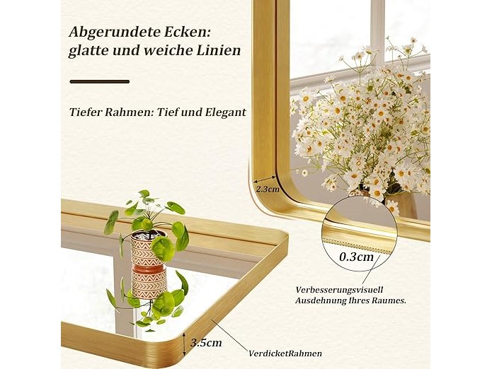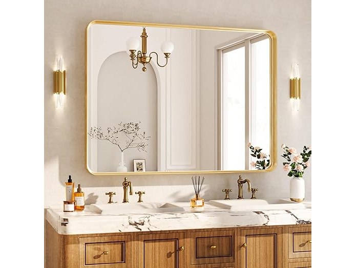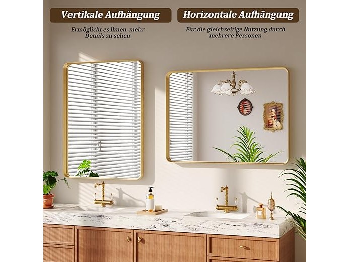 Ongebruikt, ok, vijzen en pluggen ontbreken, Koonmi wandspiegel (120 x 90 cm), luxe high-end rechthoekige badkamerspiegel, gefileerde hoeklijst, spiegel, horizontaal of verticaal opgehangen, goud, B0DLVWJHC2