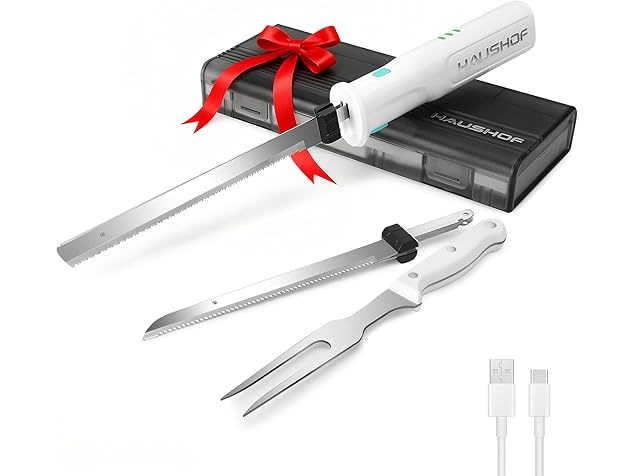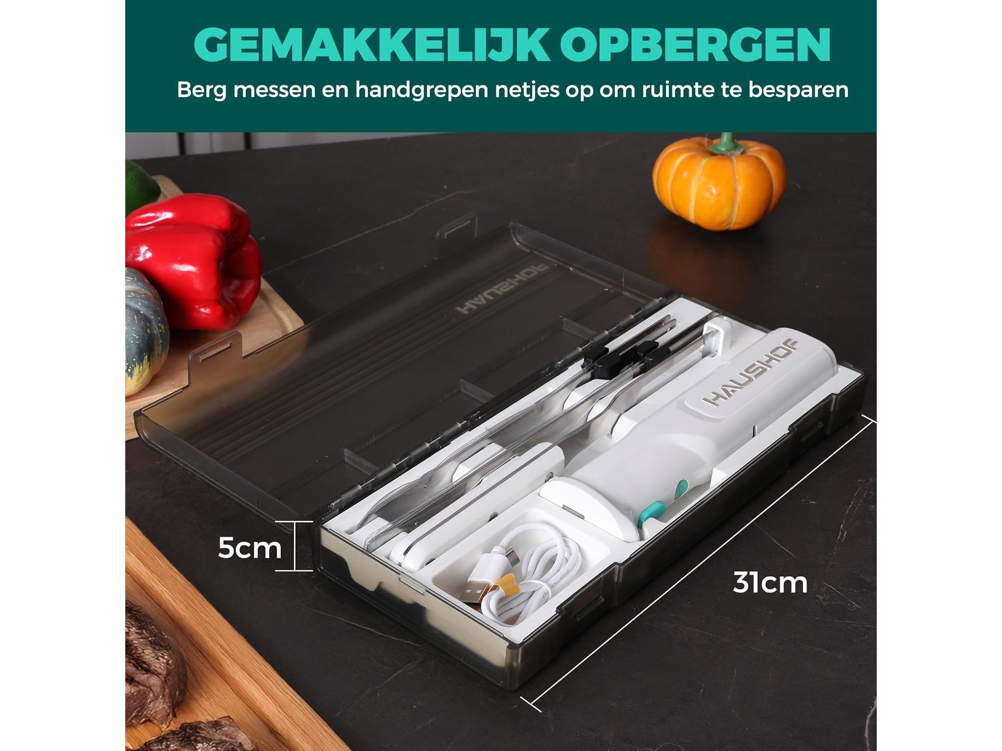 Minieme gebruikssporen, getest en werkend, ok, verpakking ontbreekt, HAUSHOF elektrische messenset 8V, snoerloos keukenmes met roestvrijstalen messen, 2000 mAh batterij voor nauwkeurig snijden van brood, vlees en kaas, met opbergdoos, wit, B0D21VSTS4