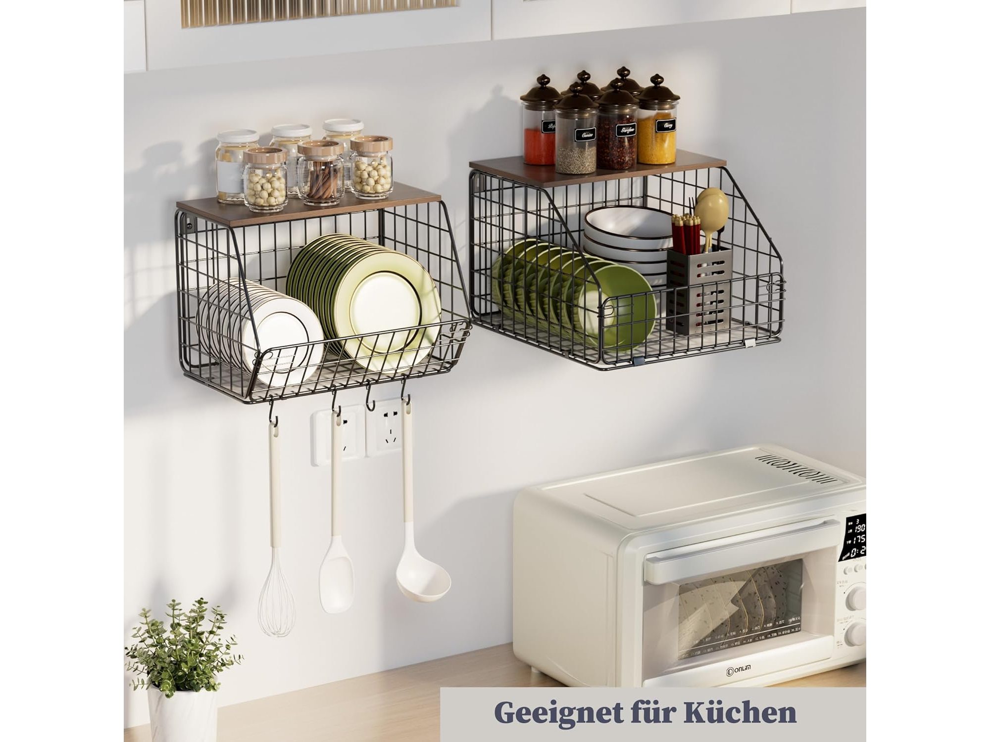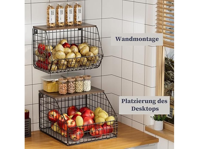 Ongebruikt, ok, Bimiti Hangende fruitmand (2 stuks), etagère, fruitmand aan de muur voor keuken, keukenorganizer met houten deksel met 4 bananenophanghaken, stapelbare groentemand voor het bewaren van fruit, B0CYQ77SC7