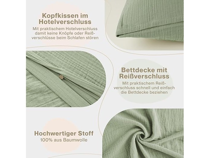Ongebruikt, volledig, ok, Blumtal mousseline bedlinnen (200x220 cm) - OEKO-TEX gecertificeerd bedlinnen 200x220 katoen - dekbedovertrek 200x220 + 2x kussensloop 80x80 - bedlinnen 200x220 mousseline - bedlinnen zomergroen, B0D6Z3JK74