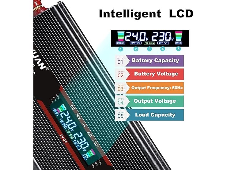 Minieme gebruikssporen, getest en werkend, volledig, ok, LVYUAN Spanningsomvormer, 24 V, 230 V, 1500 W/3000 W, omvormer, stroomomvormer met lcd-scherm, 2 EU stopcontact, ventilator en 5 V USB aansluitingen, incl. sigarettenaansteker, zwart, B095KDV8RV