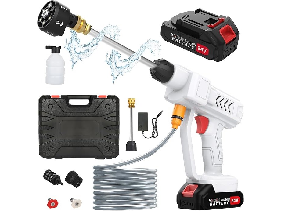 Gebruikssporen, getest en werkend, volledig, ok, Hydro Blast Accu-hogedrukreiniger, mobiele hogedrukreiniger, met 2 batterijen, 6-in-1 multifunctioneel mondstuk, 5 m slang, accu-drukreiniger voor auto, terras, gazons,B0FGJHP66R